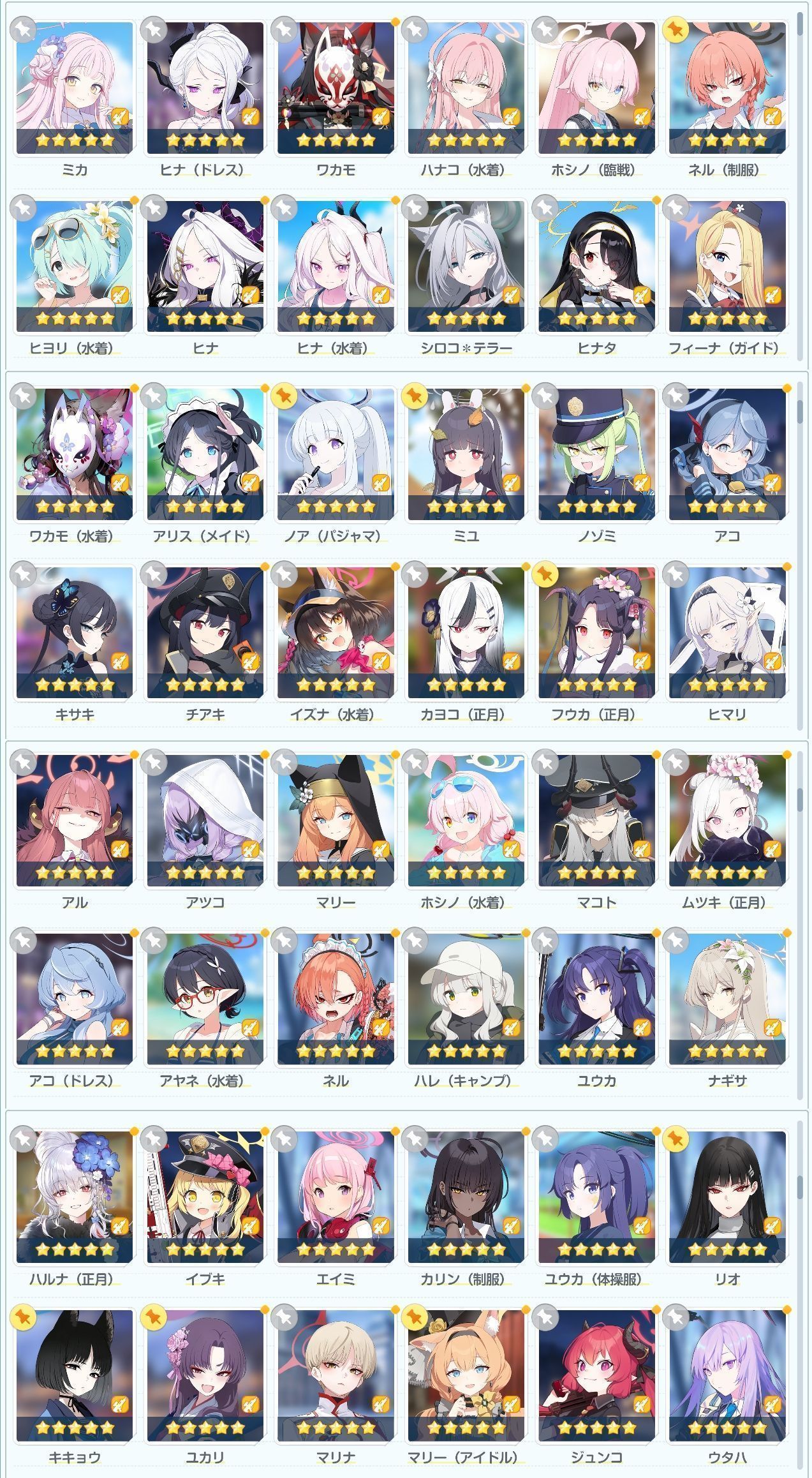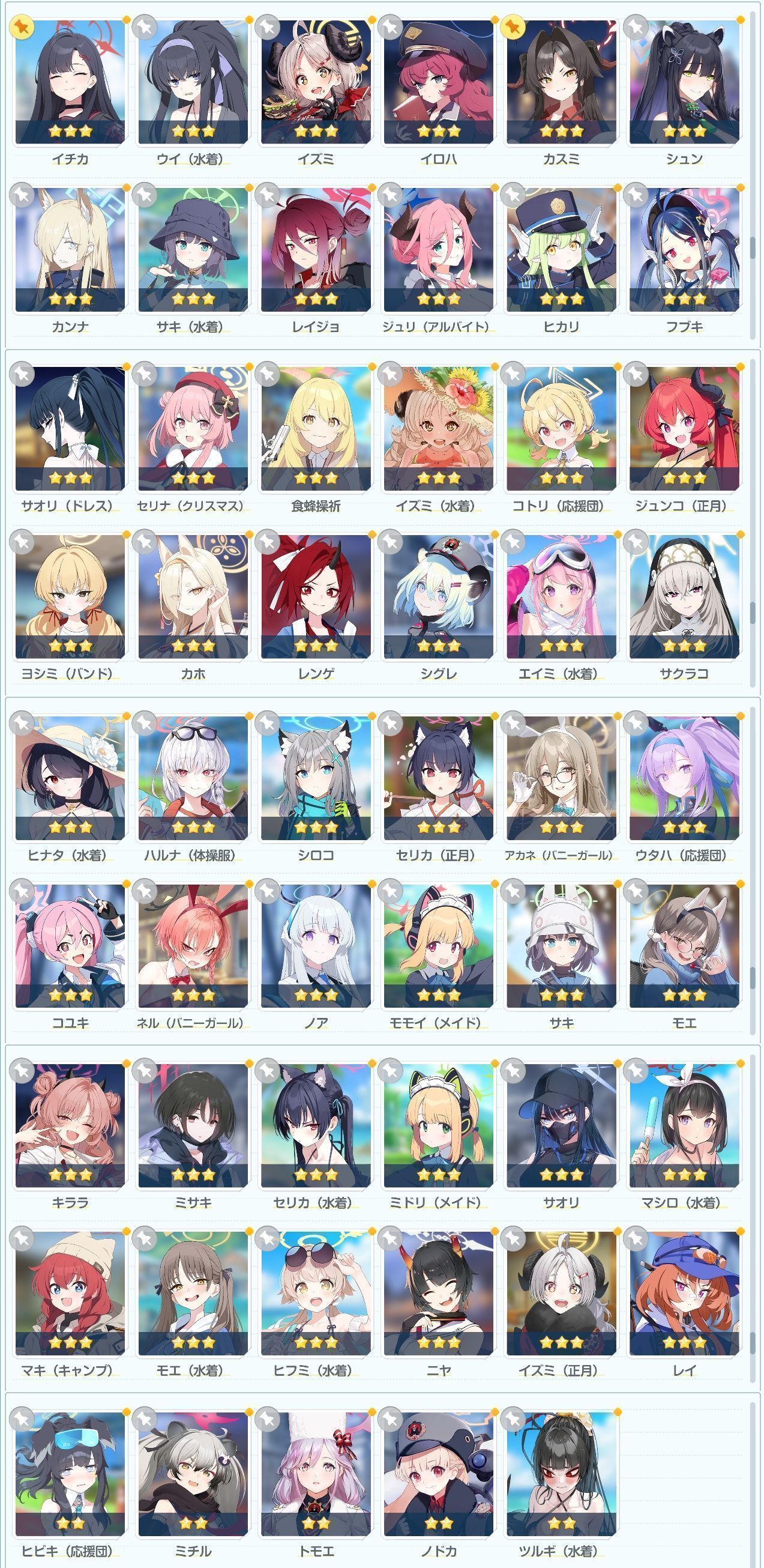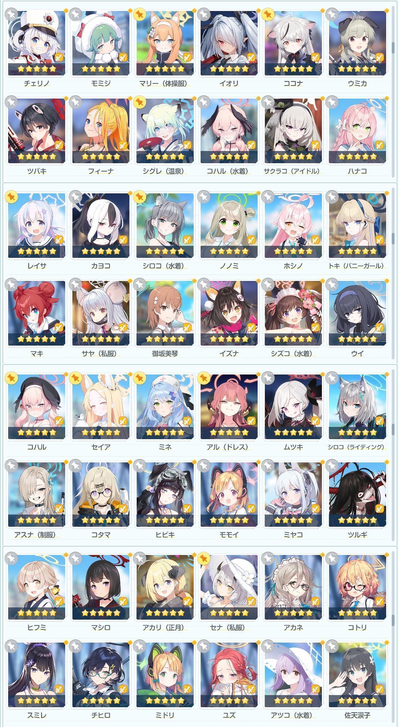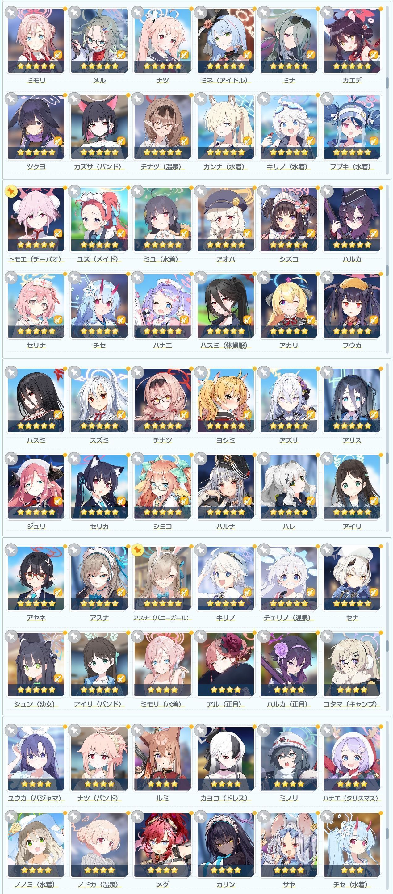 アコ イオリ イロハ ウイ カヨコ(正月) キサキ ココナ シロコ(テラー) シロコ(水着) セイア チェリノ トモエ(チーパオ) ナギサ ネル(制服) ハナコ(水着) ハレ(キャンプ) ヒナ(ドレス) ヒマリ ヒヨリ(水着) フウカ(正月) ホシノ(水着) ホシノ(臨戦) マリー(アイドル) ミカ ムツキ(正月) ユウカ(体操服) リオ ワカモ 御坂美琴 食蜂操祈
