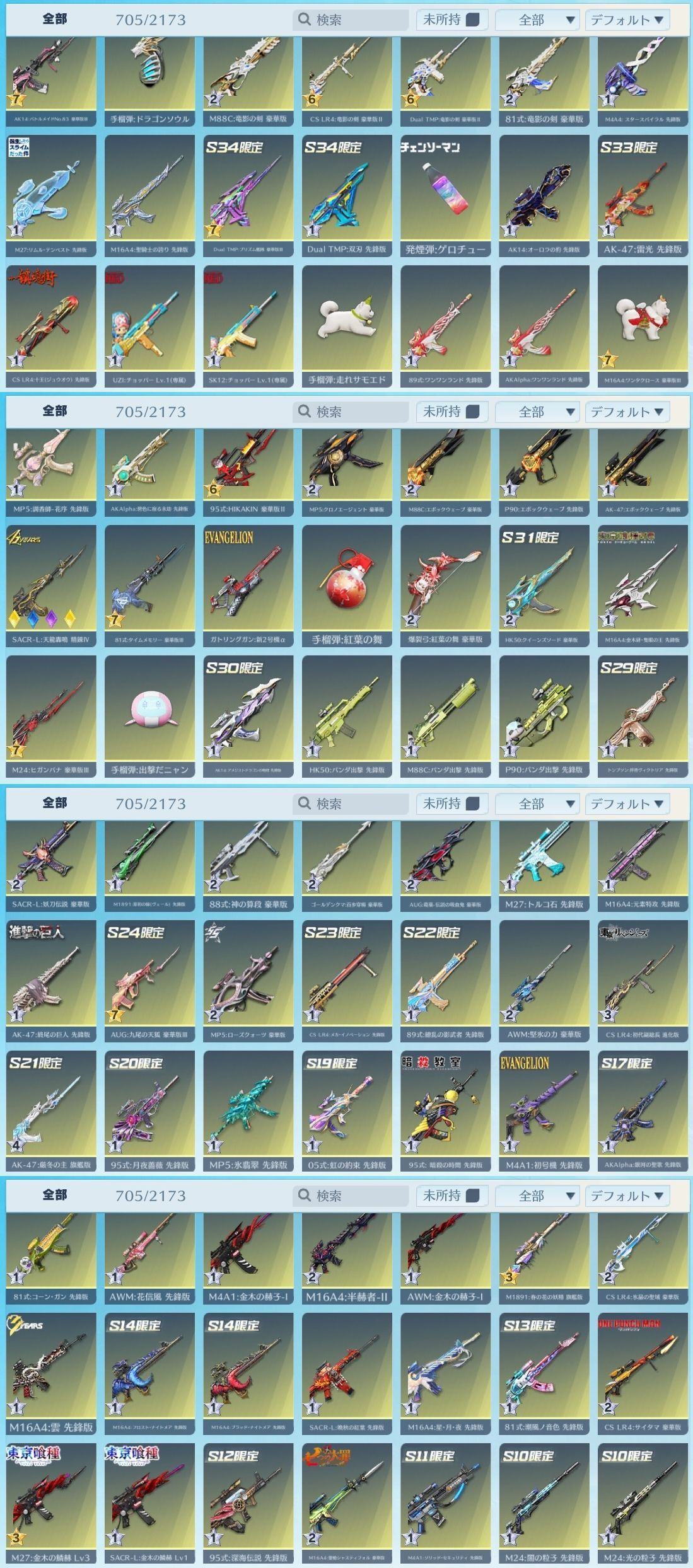 涅槃:氷炎のセラフ 森羅万象:第六天魔王 M4A1:双生の闇光 レイ&アスカVer. AK-47:天翔ける金龍 超DX M16A4:氷雪の炎竜 M4A4:アズラーイール SACR-H:氷炎のセラフ 第13号機 飛行服:コーン登場 パラシュート:純白のメロディ(殿堂パラシュート) 佐野万次郎 釘崎野薔薇 五条悟 ミカサ レイ