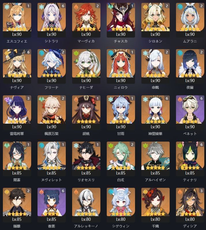 エスコフィエ マーヴィカ シトラリ チャスカ シロネン ムアラニ クロリンデ アルレッキーノ 閑雲 ナヴィア フリーナ ヌヴィレット ナヒーダ 夜蘭 八重神子 申鶴 雷電将軍 楓原万葉 胡桃 鍾離