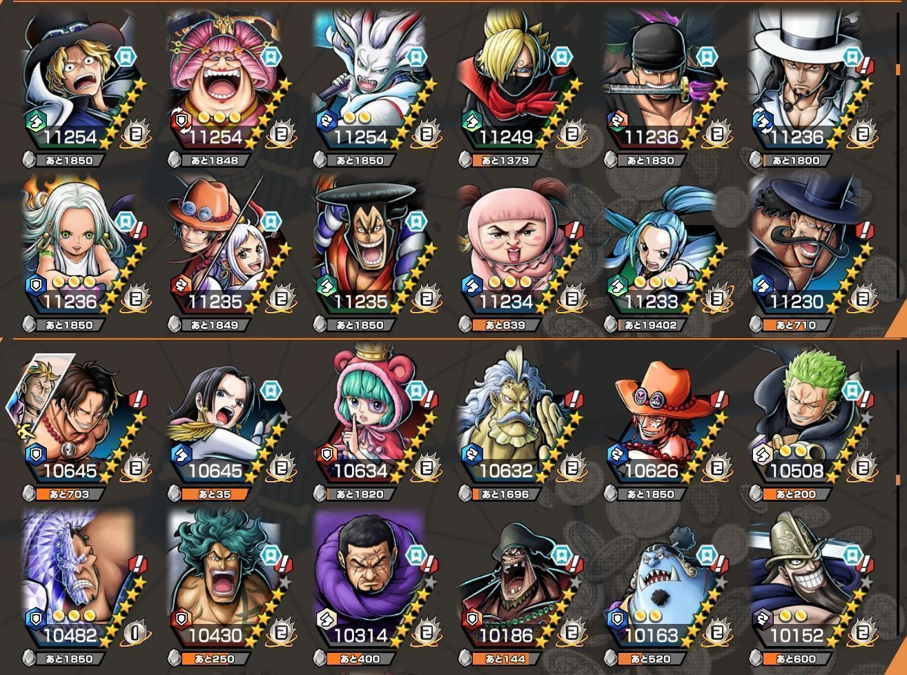 黄猿 黒ロジャー クザン 黒ガープ S-スネーク 覚醒ルッチ シャンクス(神避) サボ 緑ロジャー 赤犬 ヤマト カイドウ キッド&ロー 緑ニカ カイドウ(人獣) ゾロ(閻魔) 白ひげ エース&ヤマト シャンクス(RED) 黒ひげ シャンクス(四皇) 花魁おリン ヤマト(人獣) ビッグ・マム ゼファー 光月おでん