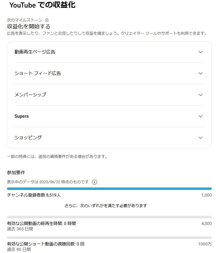 ✔収益化条件のうち、難しいと言われている「登録者1000人」をクリア済みなので、収益化までの期間を短縮出来る。