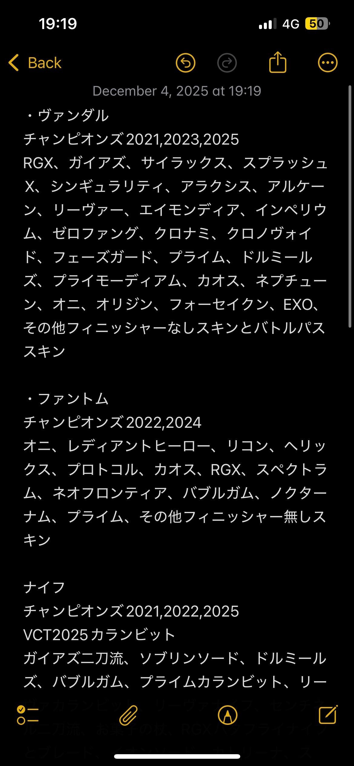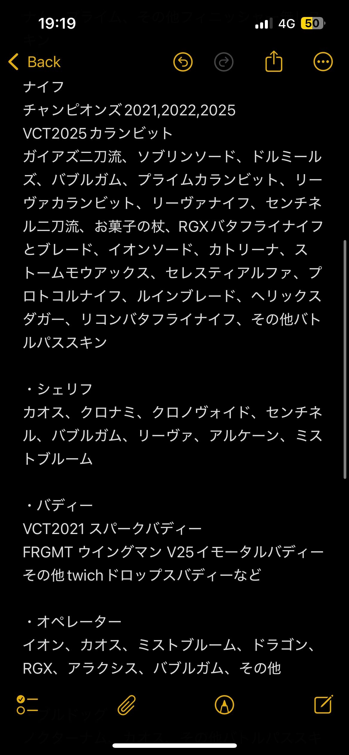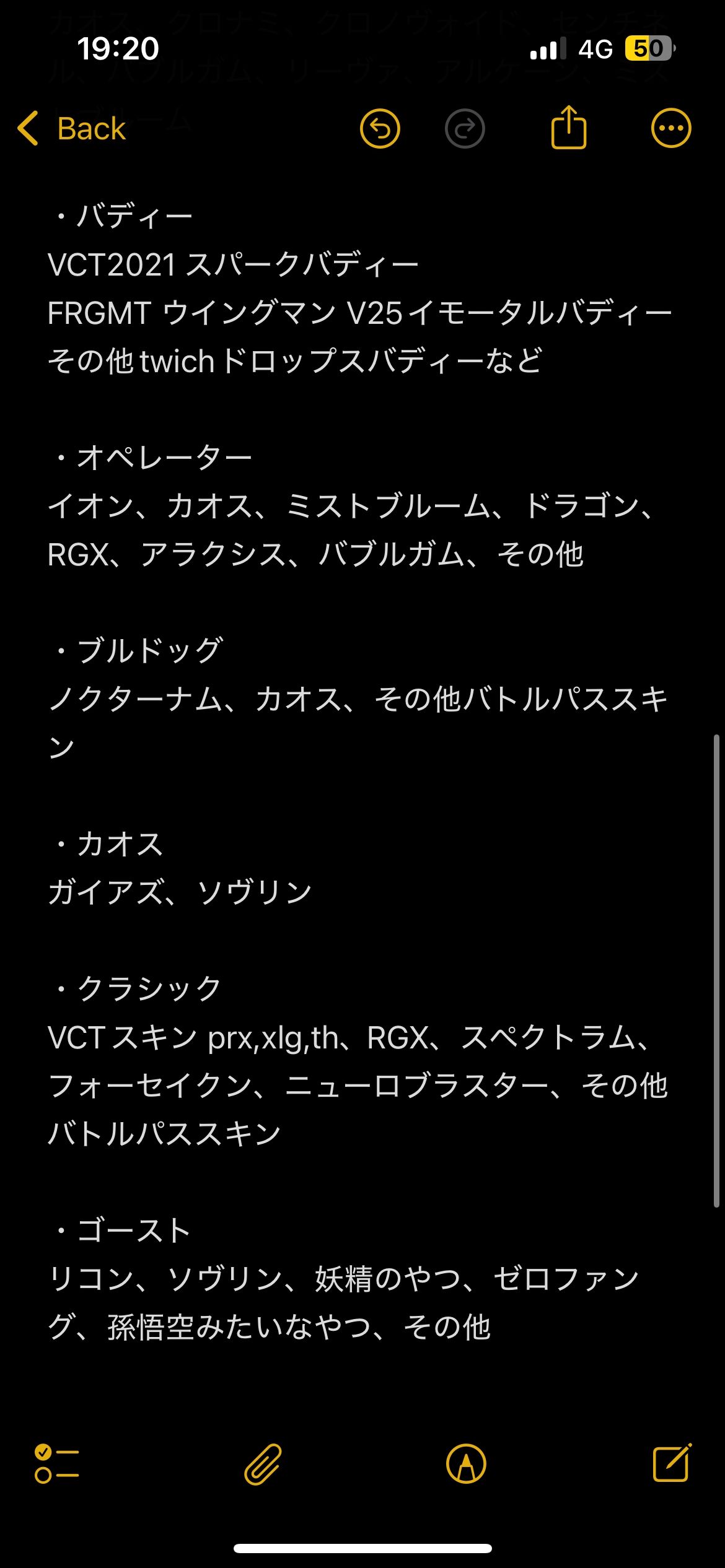 2021VCTスパークバディーとスプレーFRGMTウイングマンバディー、その他Twitchスプレーなどです。持っているスキン、特にヴォンダルは9割方レベル解放されています。色に関しては解放してないものあり。