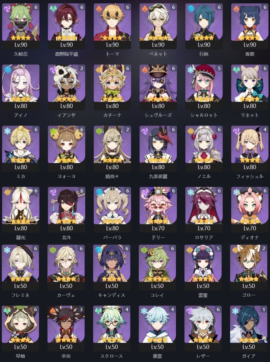 ラウマ スカーク ヴァレサ マーヴィカ シロネン エミリエ アルレッキーノ 閑雲 フリーナ ナヒーダ 夜蘭 雷電将軍 楓原万葉 鍾離 蒼耀 千烈の日輪 祭星者の眺め 赤月のシルエット 静水流転の輝き 千夜に浮かぶ夢 草薙の稲光 終焉を嘆く詩