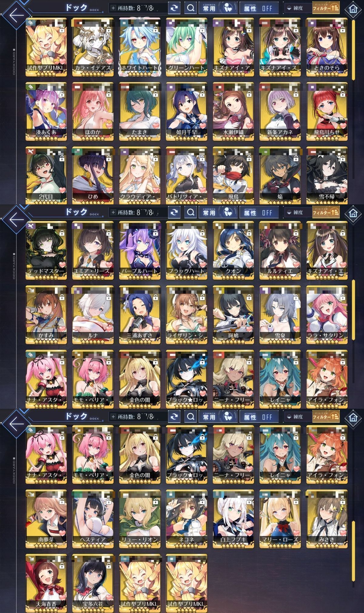 アカウント特定防止といった観点から、主なキャラクター・装備・衣装を抜粋して記載させていただいております。