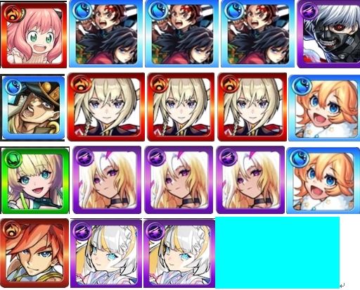 アーニャα+炭治郎&義勇×3+金木研+承太郎SC+マサムネ×3+ルシファー×3+ニケ+アナスタシア×2+エクスカリバー+マギア×2+オーブ4330、合計限定35体、★5/★6キャラ150体