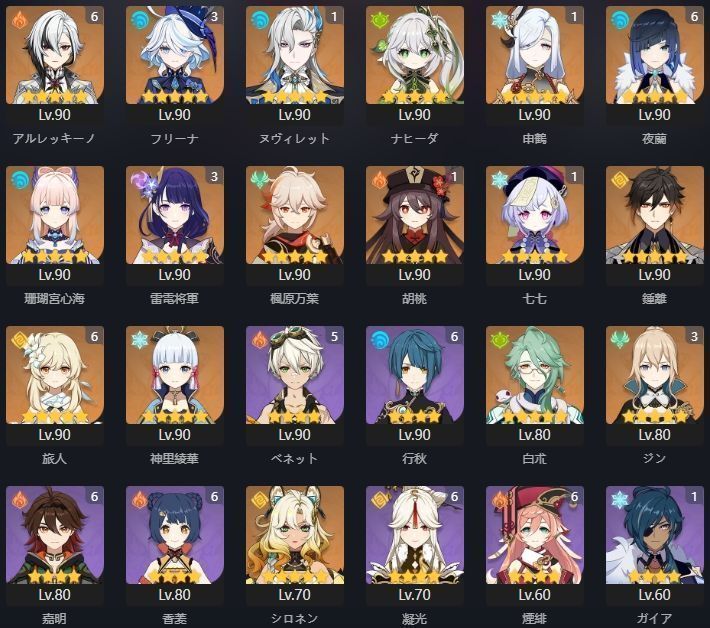 シトラリ シロネン アルレッキーノ フリーナ ヌヴィレット ナヒーダ 夜蘭 申鶴 雷電将軍 楓原万葉 胡桃 鍾離 赤月のシルエット 静水流転の輝き 久遠流転の大典 若水 草薙の稲光 蒼古なる自由への誓い 護摩の杖
