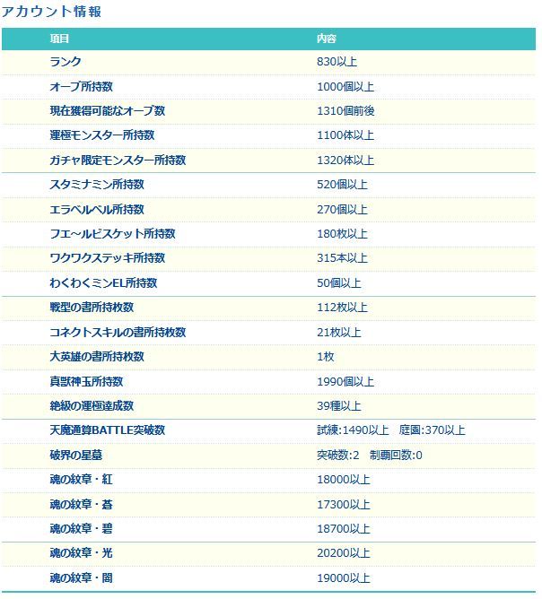 アカウント特定防止といった観点から、主なモンスターを抜粋して記載させていただいております。