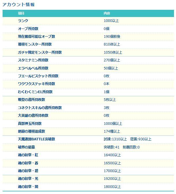 アカウント特定防止といった観点から、主なモンスターを抜粋して記載させていただいております。