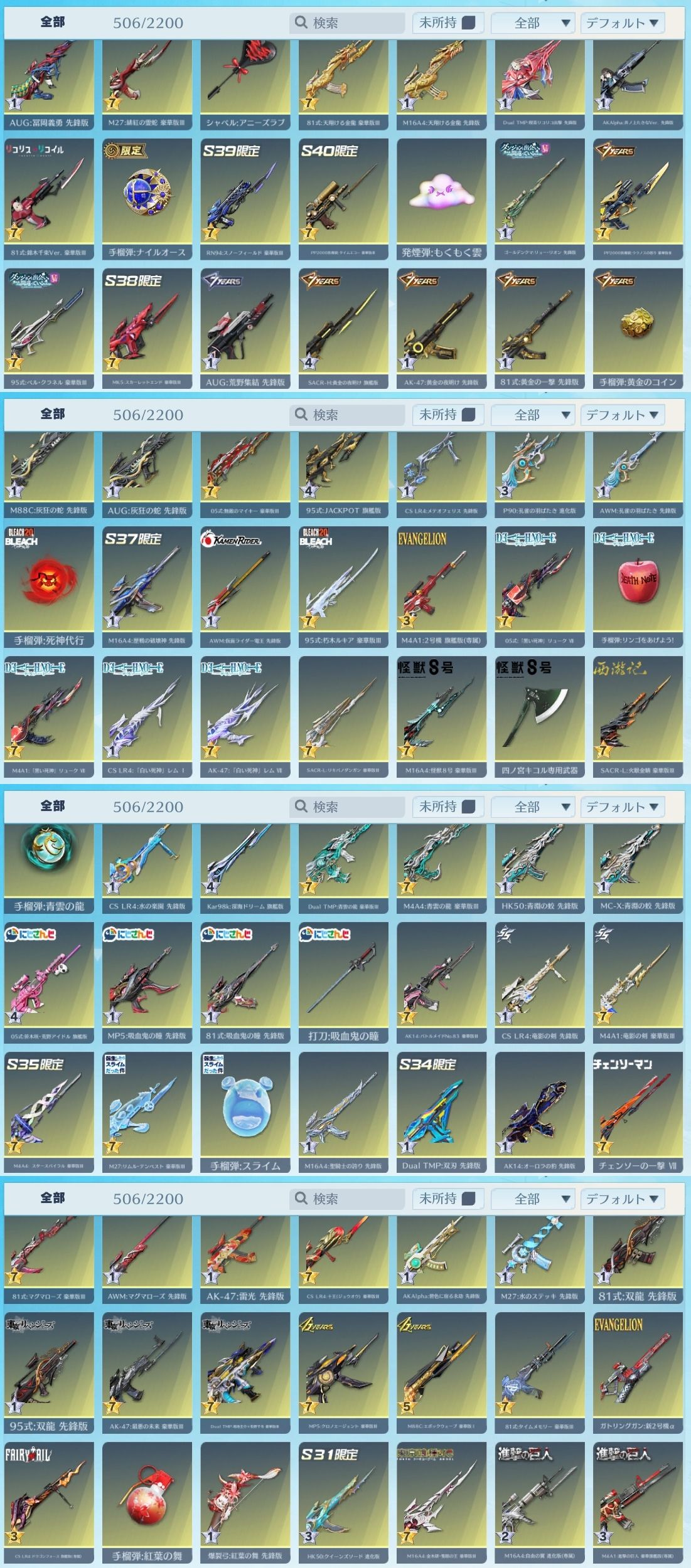 天上天下:唯我独尊 世界:双生の闇光 レイ&アスカVer. 螺旋:氷雪の炎竜 進撃の巨人:自由の心 M4A1:【デンカメン】 M4A1:五条悟・無下限呪術の使い手 M4A1:硬質化の力 AK-47:現代最強の呪術師・五条悟 95式:唯我独尊 95式:隻眼 M16A4:氷雪の炎竜 M16A4:レゾナンス・ゼロ 81式:業火の刃 MC-X:乱世の魔神 M4A4:アズラーイール M4A4:心を燃やせ 煉獄杏寿郎 SACR-H:氷炎のセラフ 佐野万次郎:唯我独尊 呪いの王・両面宿儺 氷炎のセラフ アズラーイール 五条悟:無下限呪術の使い手 氷雪の炎竜 虎杖悠仁 五条悟