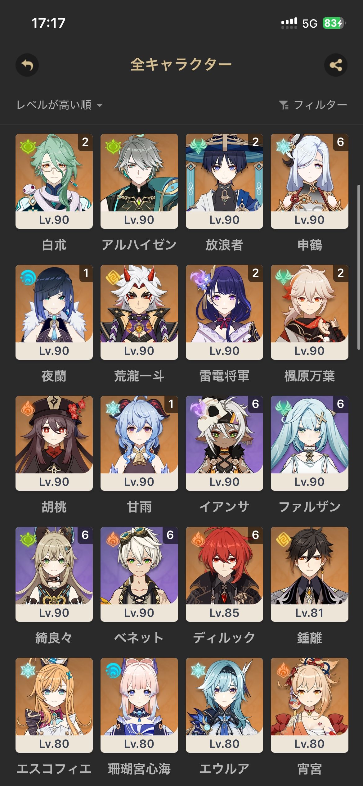 完凸キャラ24、完凸武器9、スコア50多数、幽境過去開催含めて全てアルティメット180秒以内