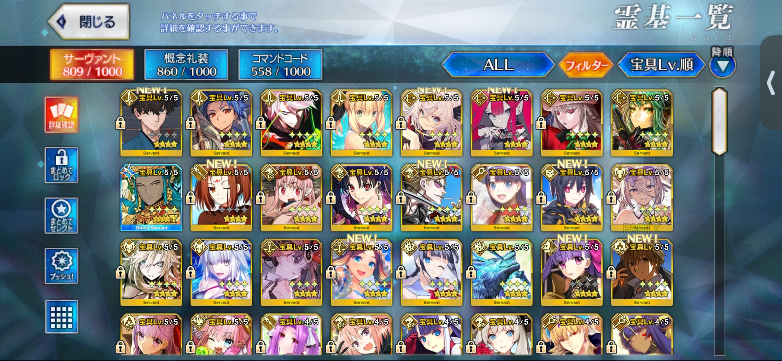 ログレス、水着伊吹、リリス、モルガン、アルク、シエル、ファンタ、カズラが宝具5(水着伊吹は6)