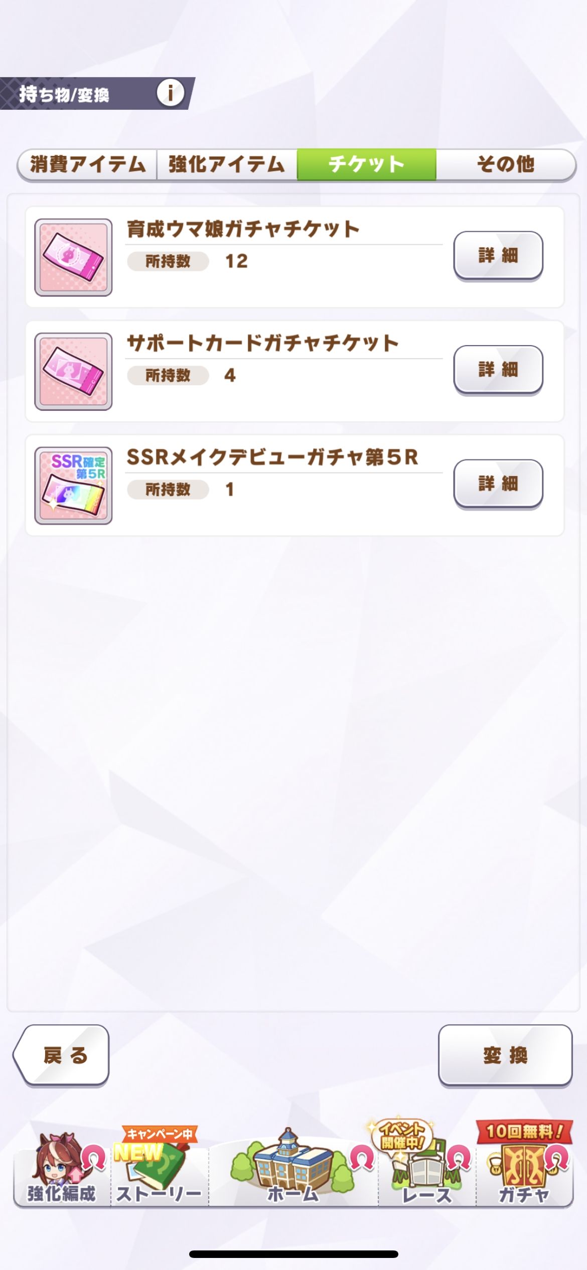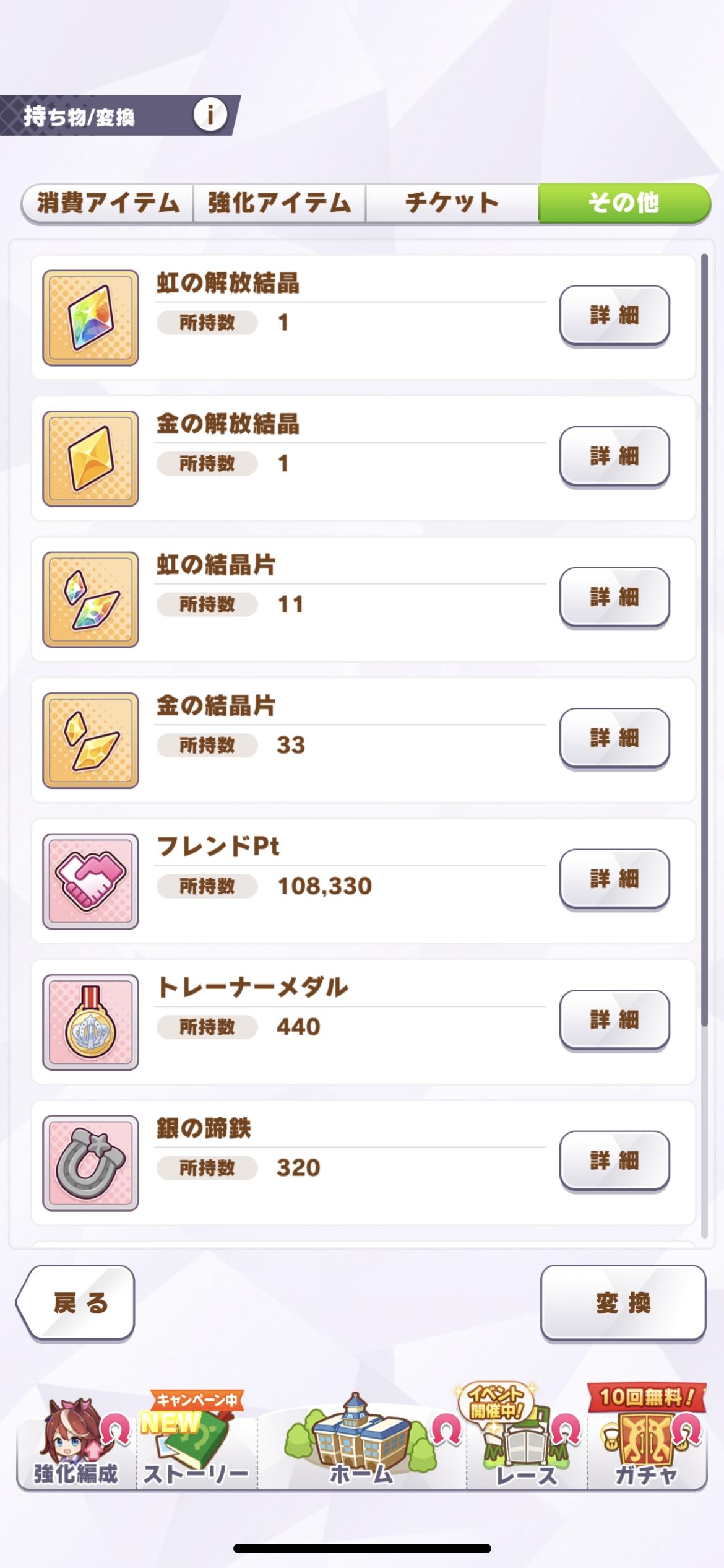 夢の煌めき478、育成ウマ娘ガチャチケット12枚、サポートカードガチャチケット4枚、虹の解放結晶1