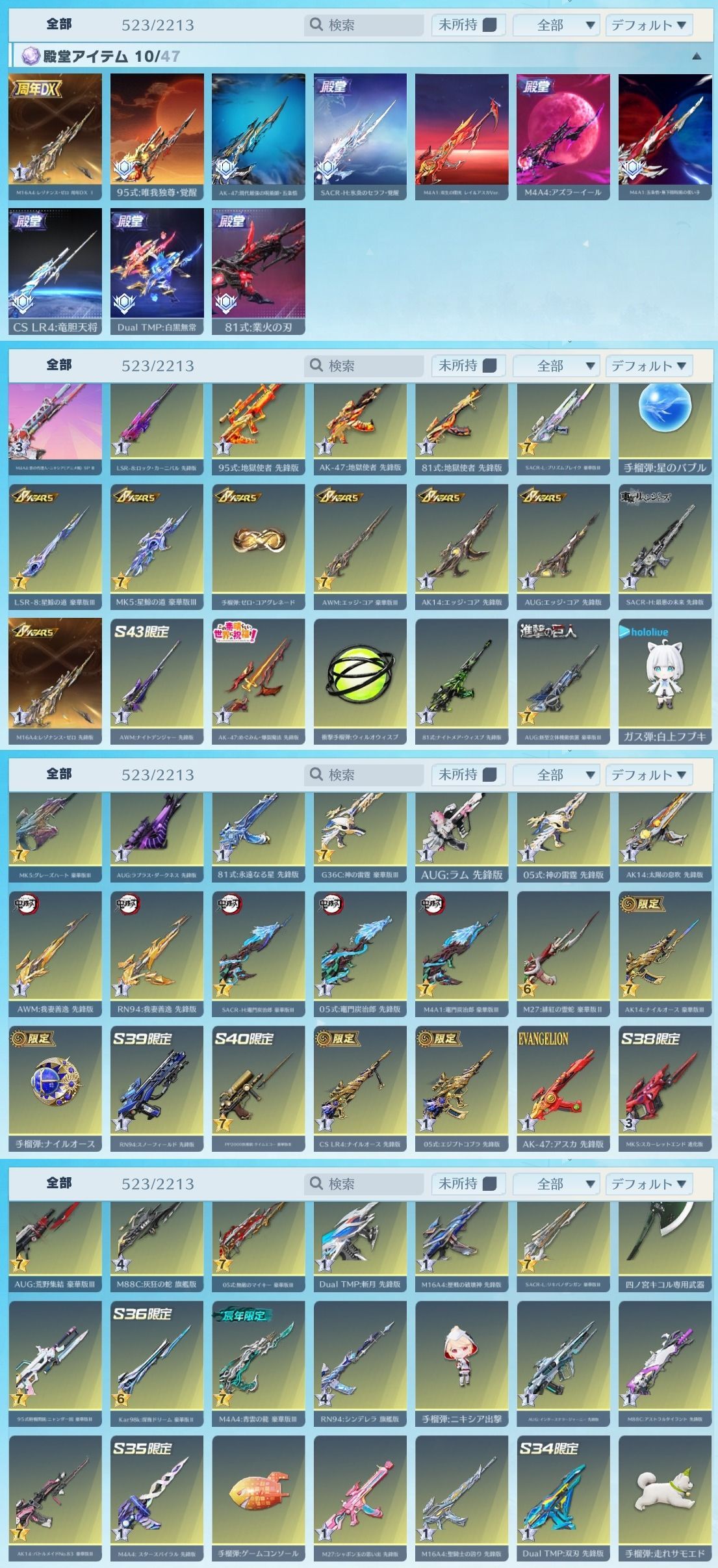 涅槃:氷炎のセラフ 無下限呪術:五条悟 飛雲:竜胆天将 M4A1:双生の闇光 レイ&アスカVer. M4A1:五条悟・無下限呪術の使い手 AK-47:現代最強の呪術師・五条悟 95式:唯我独尊 CS LR4:竜胆天将 M16A4:レゾナンス・ゼロ周年DX 81式:業火の刃 Dual TMP:白黒無常 M4A4:アズラーイール SACR-H:氷炎のセラフ 飛行服:メリオダス 飛行服:コーン登場