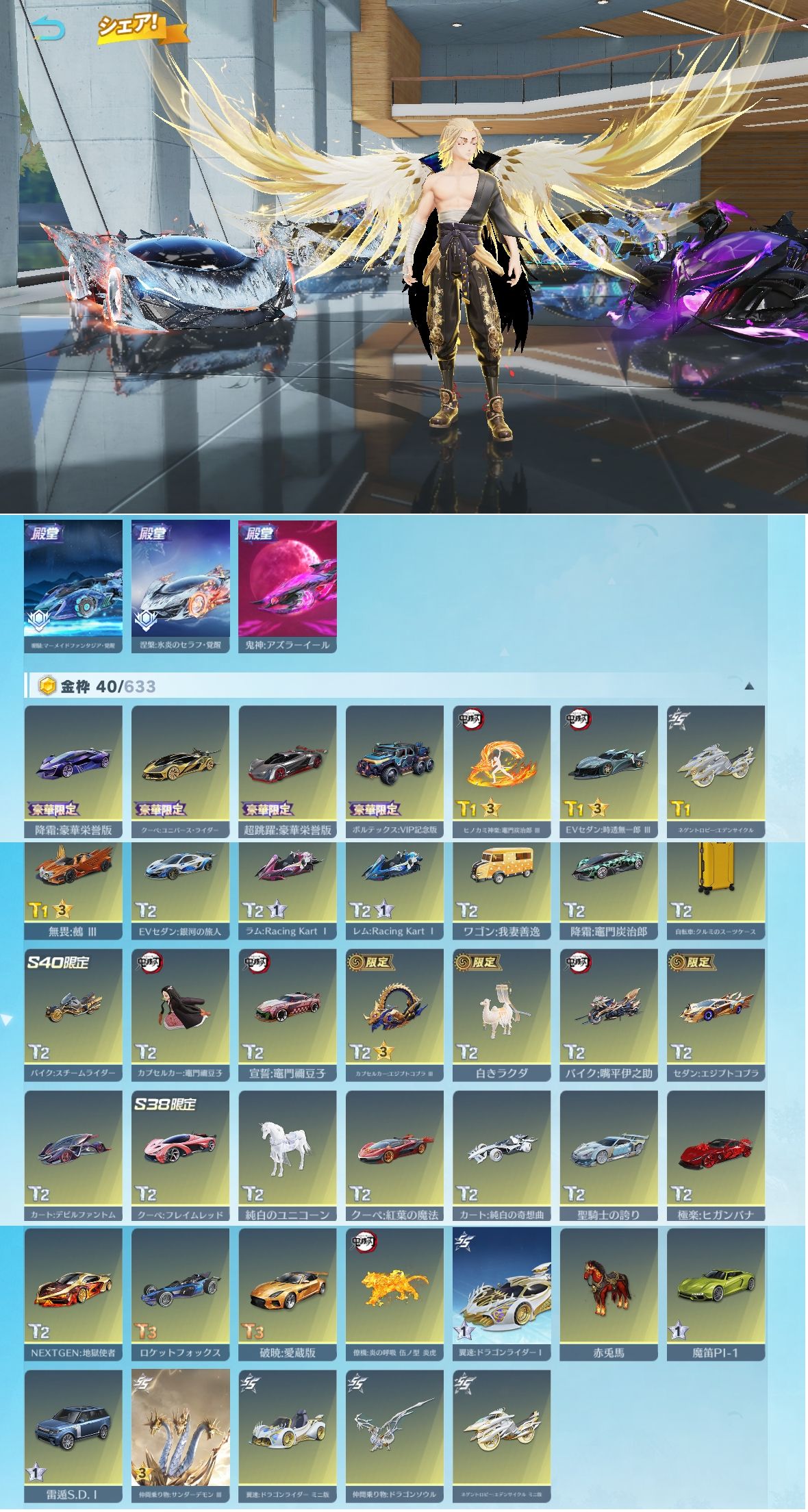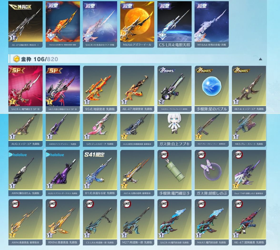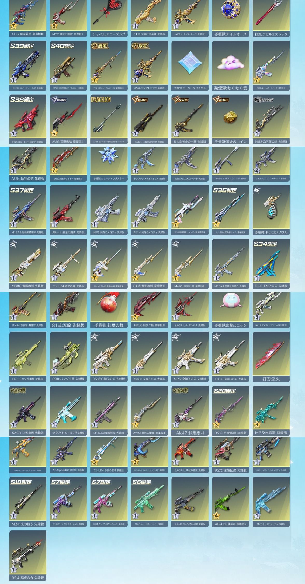 潮騒:マーメイドファンタジア 涅槃:氷炎のセラフ 鬼神:アズラーイール AK-47:日輪の倚天・神兵DX CS LR4:竜胆天将 M16A4:氷雪の炎竜 M4A4:アズラーイール M4A4:心を燃やせ 煉獄杏寿郎 SACR-H:氷炎のセラフ 佐野万次郎:唯我独尊 マーメイド 氷炎のセラフ 飛行服:コーン登場 パラシュート:純白のメロディ