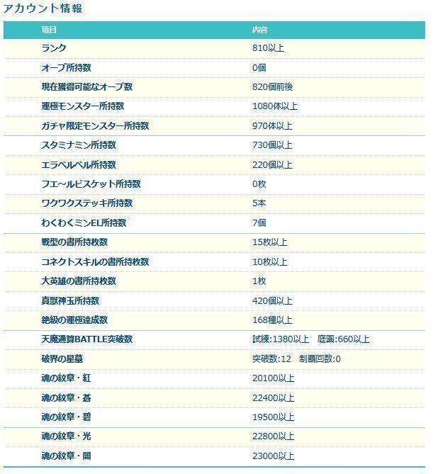 アカウント特定防止といった観点から、主なモンスターを抜粋して記載させていただいております。