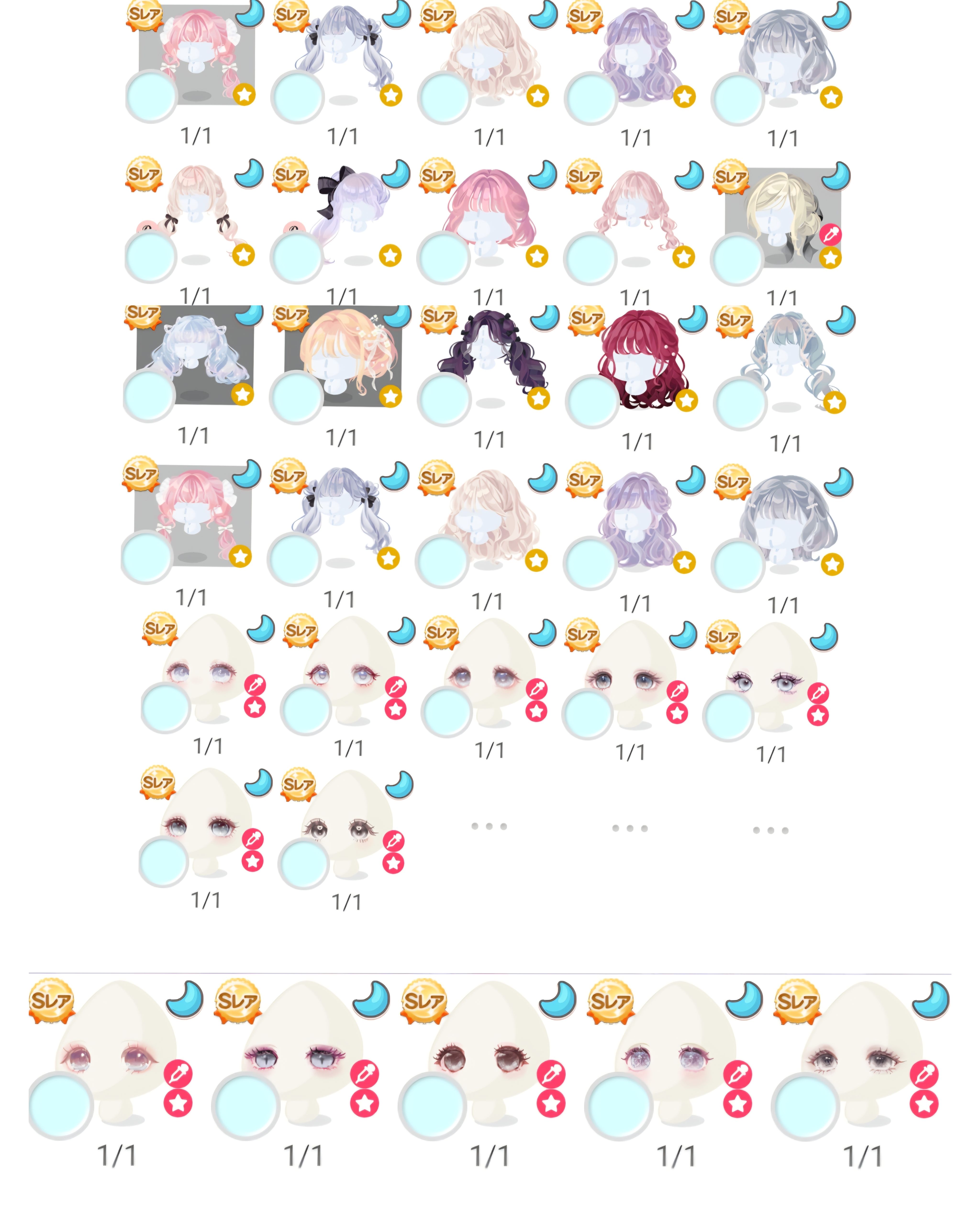 【瞳】煌めく午後のアリスの瞳、祈りを捧げる堕天使の瞳、物語に惹かれるアリスの瞳、シロクマサンタアイ、うるうるレインボーアイ、うっとりと夢見る瞳、色づくノエルアンジュアイ、ノエルアンジュアイ、優しい白昼夢に沈む瞳、オーブソメイユアイ、無垢な鬼の瞳、トゥワイナイトアイ、クレアダスクアイ、空虚なマリオネットアイ、時の色を映すオッドアイ、プシュケーに染まる瞳、つやつやフェネックアイ、桜の魔法がかかる瞳、春の訪れに目覚める瞳、彼に恋するハートアイ、甘い森の物語の瞳、ハピネスシャイニーアイ、奇跡届けるクリスマスアイ、ミロワールローズアイ他