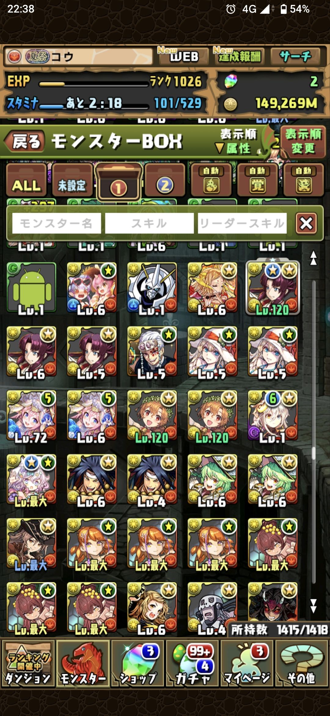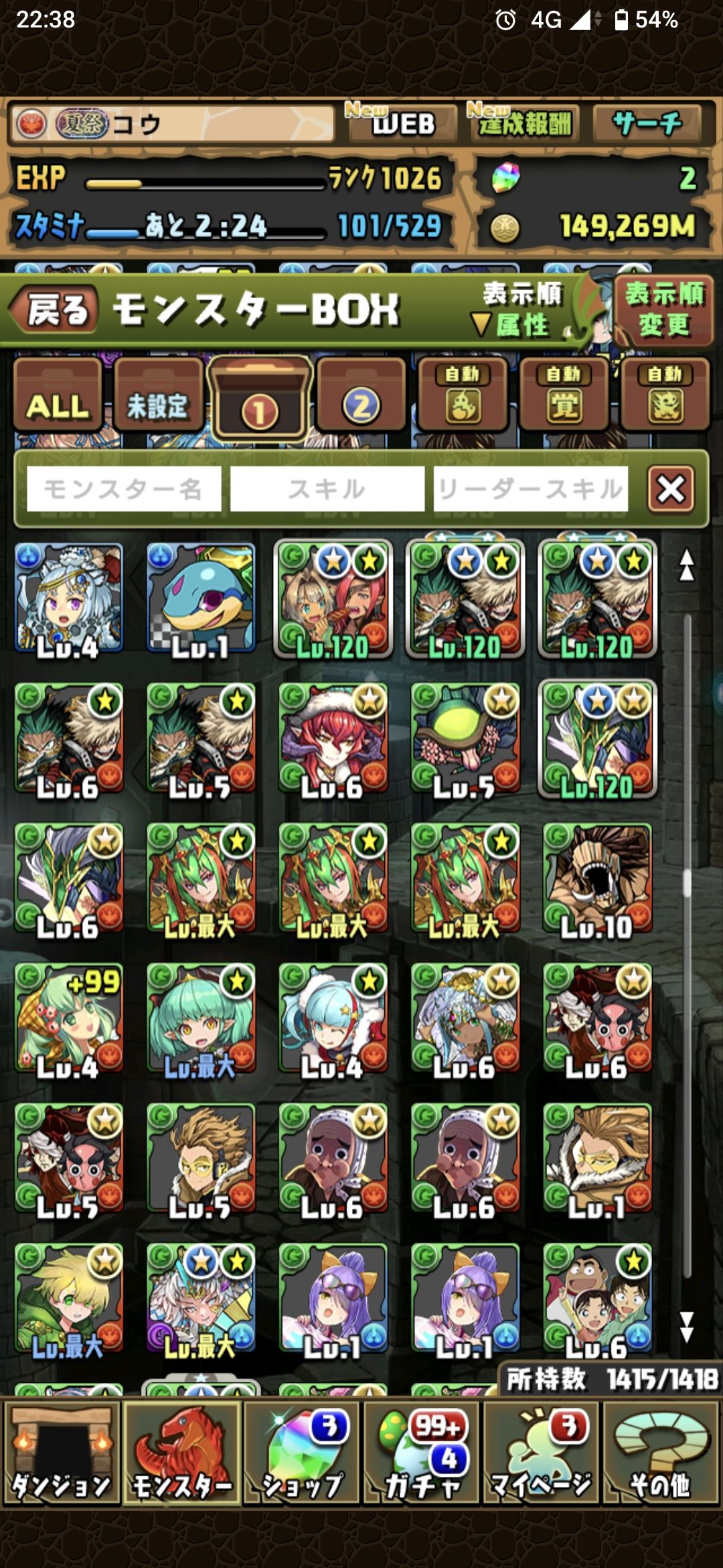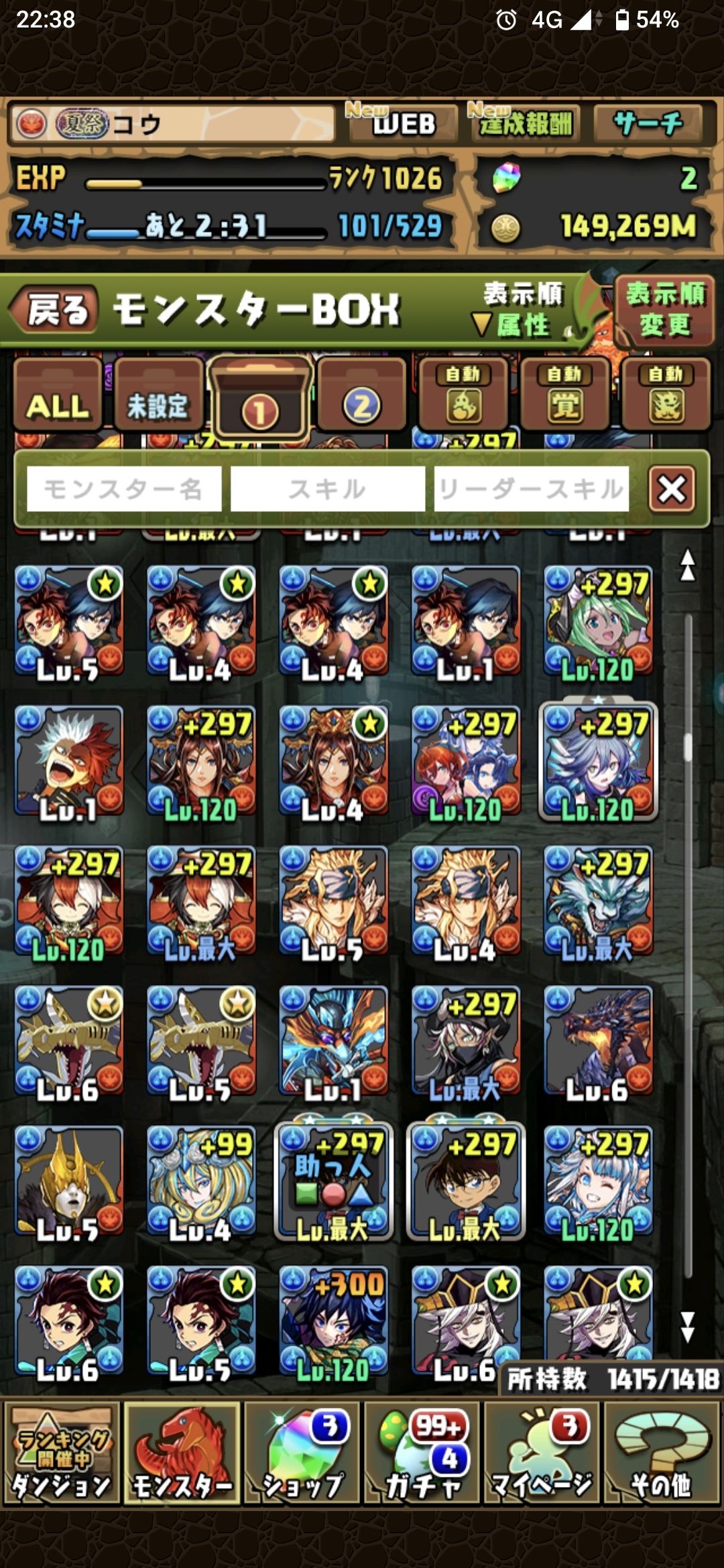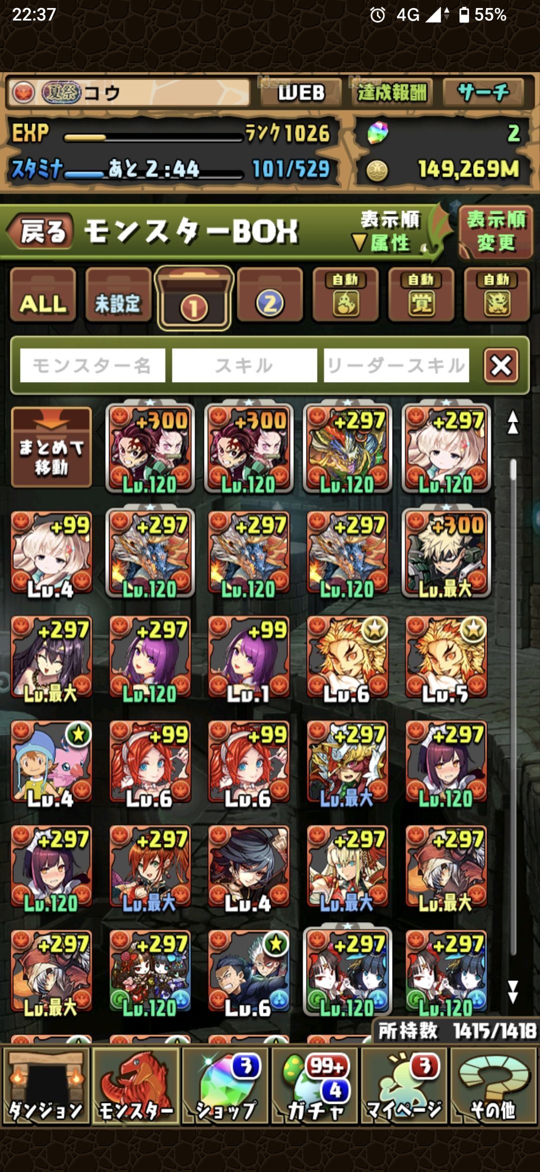 すべてのキャラは載せられないので一部として各属性の先頭を貼っておきます。所持キャラに関してはお気軽に質問してください。+297のキャラ数は正確には把握できていないので大体です。