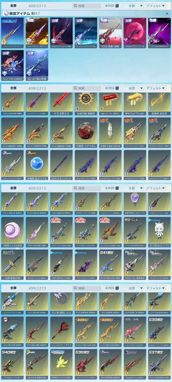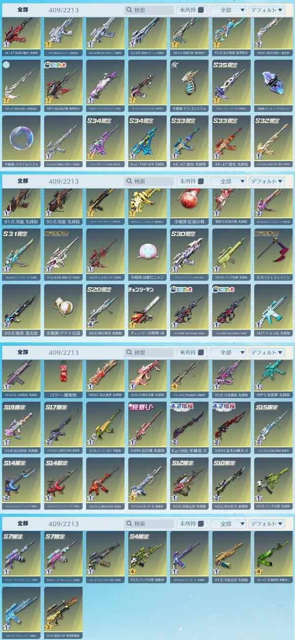 天上天下:唯我独尊 うずまきナルト オーラ:時の列車 現代最強の呪術師・五条悟 無下限呪術:五条悟 凱旋:ゴールデンウィング M4A1:五条悟・無下限呪術の使い手 SACR-L:リキバノダンガン AK-47:海の残響 95式:隻眼 M16A4:マーメイドファンタジア Dual TMP:白黒無常 M4A4:アズラーイール M4A4:うずまきナルト SACR-H:ブラッドコア 五条悟:無下限呪術の使い手 現代最強の呪術師・五条悟 氷雪の炎竜