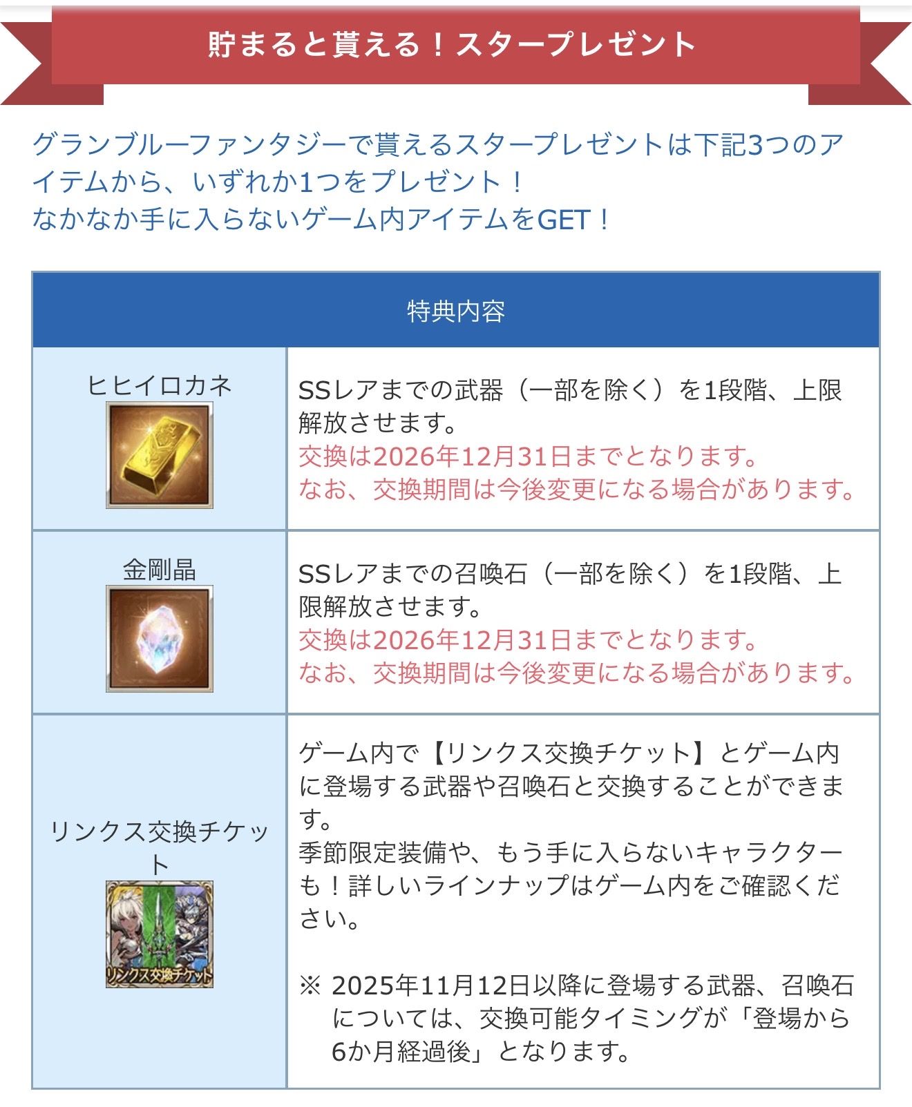 リンクスチケット、ヒヒイロカネ、金剛晶の中から一つお選びいただけます。