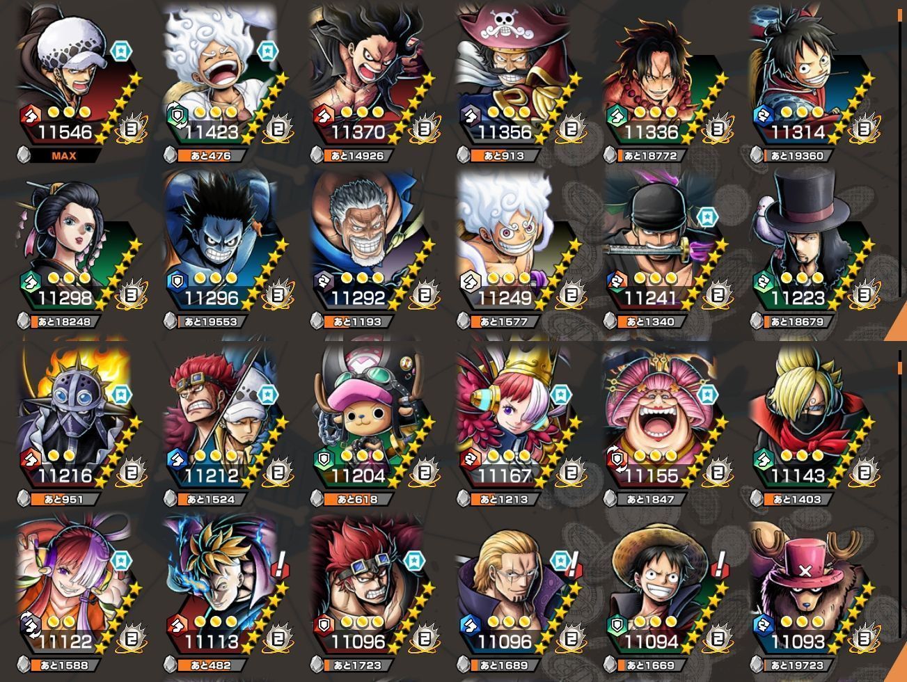 新ニカ S-スネーク 黒ロジャー 黒ガープ キッド&ロー 赤犬 夢ルフィ 緑ニカ ゾロ(閻魔) 光月おでん 花魁おリン
