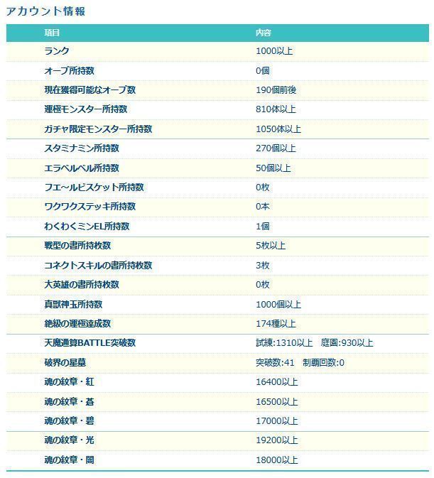 アカウント特定防止といった観点から、主なモンスターを抜粋して記載させていただいております。