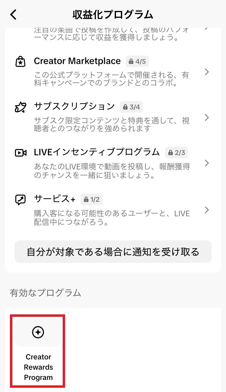 ※収益化済みアカウントの中でも、動画再生に応じて利益を受け取れるのは「Creator Rewards Program」加入済みのアカウントのみです。