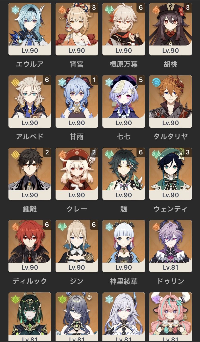 コロンビーナ、フリンズ2凸、キィニチ(★)、クロリンデ、ナヴィア、フリーナ2凸(★)、ヌヴィレット1凸(★)、ナヒーダ1凸(★)、ニィロウ、申鶴2凸、珊瑚宮心海2凸、エウルア(★)、宵宮3凸、胡桃3凸(★)、甘雨1凸(★)、タルタリア(★)、鍾離2凸(★)、クレー2凸、ウェンティ3凸(★)、神里綾華(★)、ドゥリン、ネフェル、ラウマ、スカーク、ヴァレサ、シトラリ、エミリエ、アルレッキーノ、エスコフィエ、シロネン、リネ(★)、アルハイゼン、セノ、神里綾人、荒瀧一斗(★)、千織。