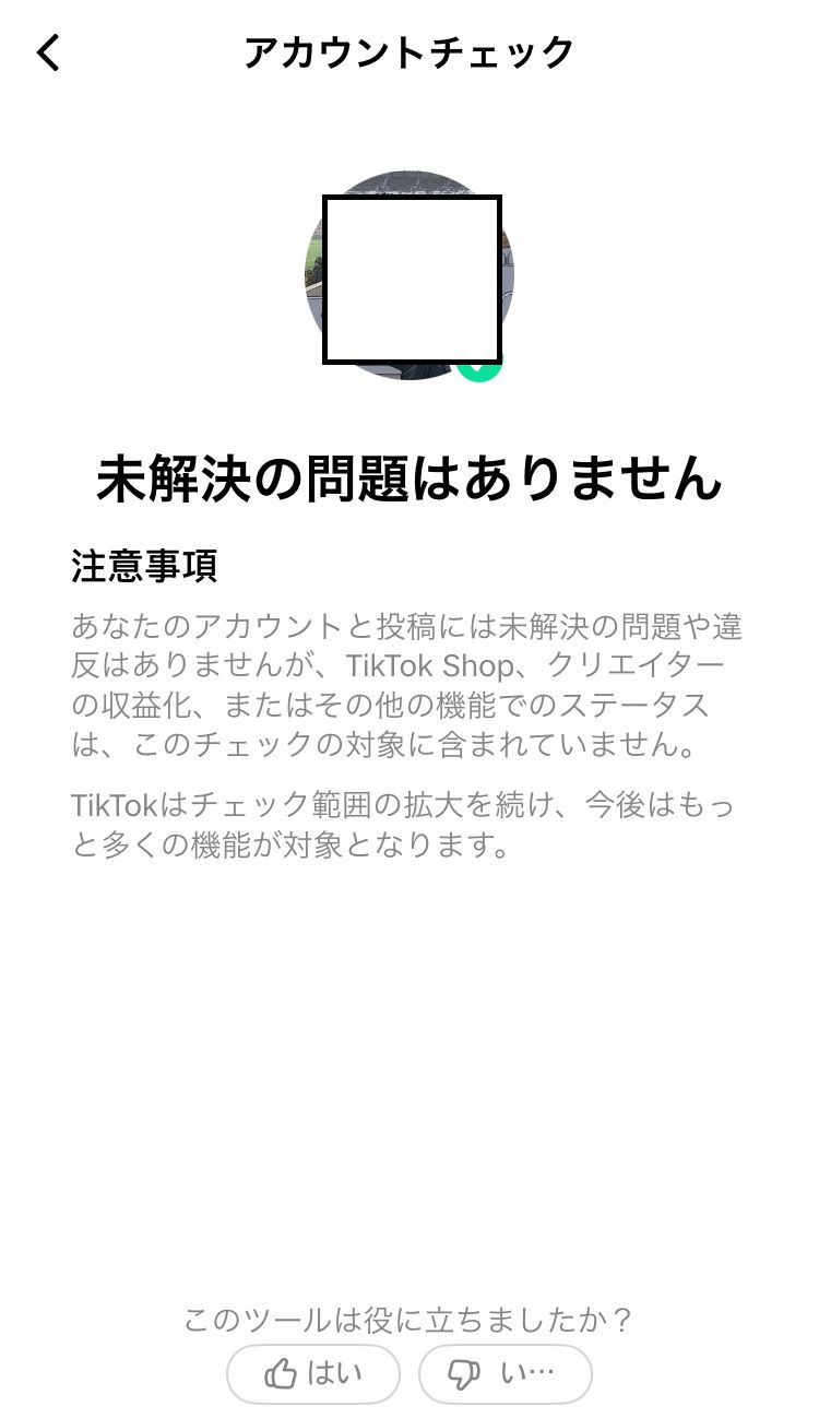 ・TikTok Studioのアカウントチェック機能でも問題が無く、アプリトップの「おすすめ」への制限がない状態の表示となっております。