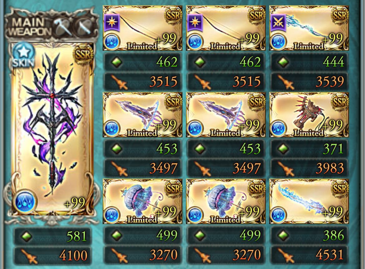 水 ヤチマ弓1本、シルヴィア刀1本、ガブ短剣2本、ワム斧3本、太歳2本、ガリサイ2本