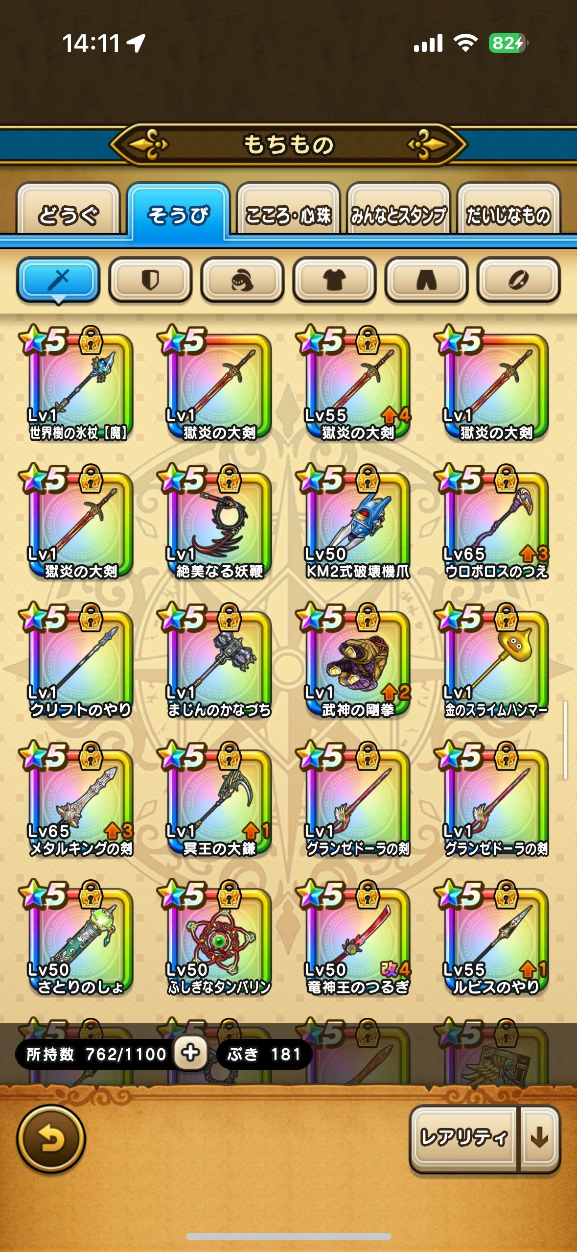 最近の主な武器で持っていないものはグリンガムの三龍鞭と最新の短剣、正月のロト盾ぐらいだと思います。