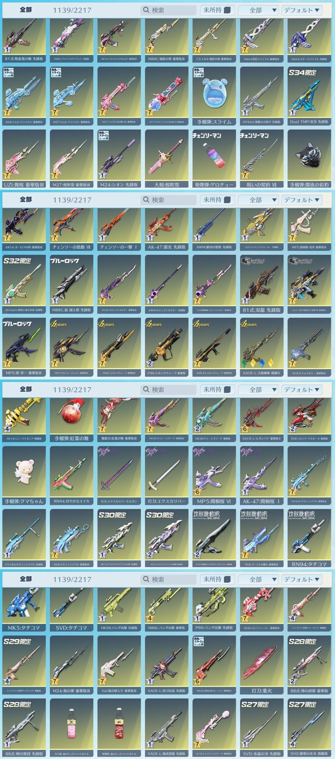 光輪RK31(ムラマク) 大領主N1 EVセダン:隻眼 涅槃:氷炎のセラフ 無下限呪術:五条悟 螺旋:氷雪の炎竜 霊想:桜色の海 霊想:海原の片隅 森羅万象:第六天魔王 M4A1:五条悟・無下限呪術の使い手 M4A1:双生の闇光 SACR-L:リキバノダンガン AK-47:海のアリア AK-47:海の残響 95式:第六天魔王 AWM:トライアンフ M16A4:氷雪の炎竜 81式:業火の刃 Dual TMP:白黒無常 AMR-83:海のアリア AMR-83:海の残響 M4A4:リヴァイ・悔いなき選択 SACR-H:氷炎のセラフ 氷竜の瑠璃 炎竜の明珠 五条悟:無下限呪術の使い手