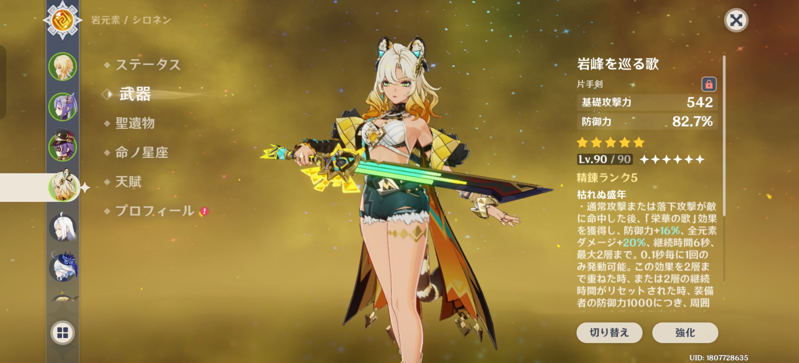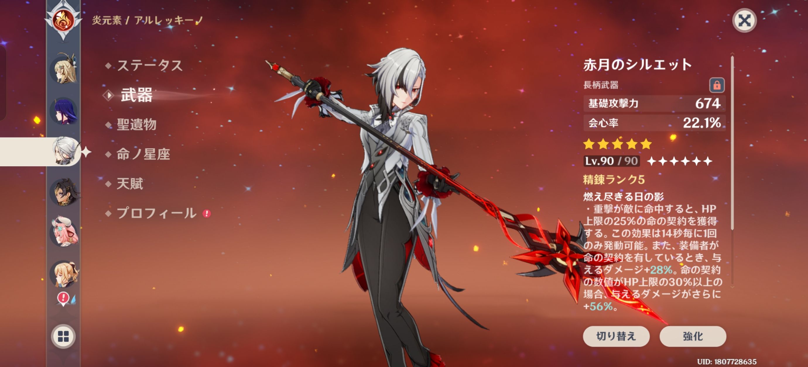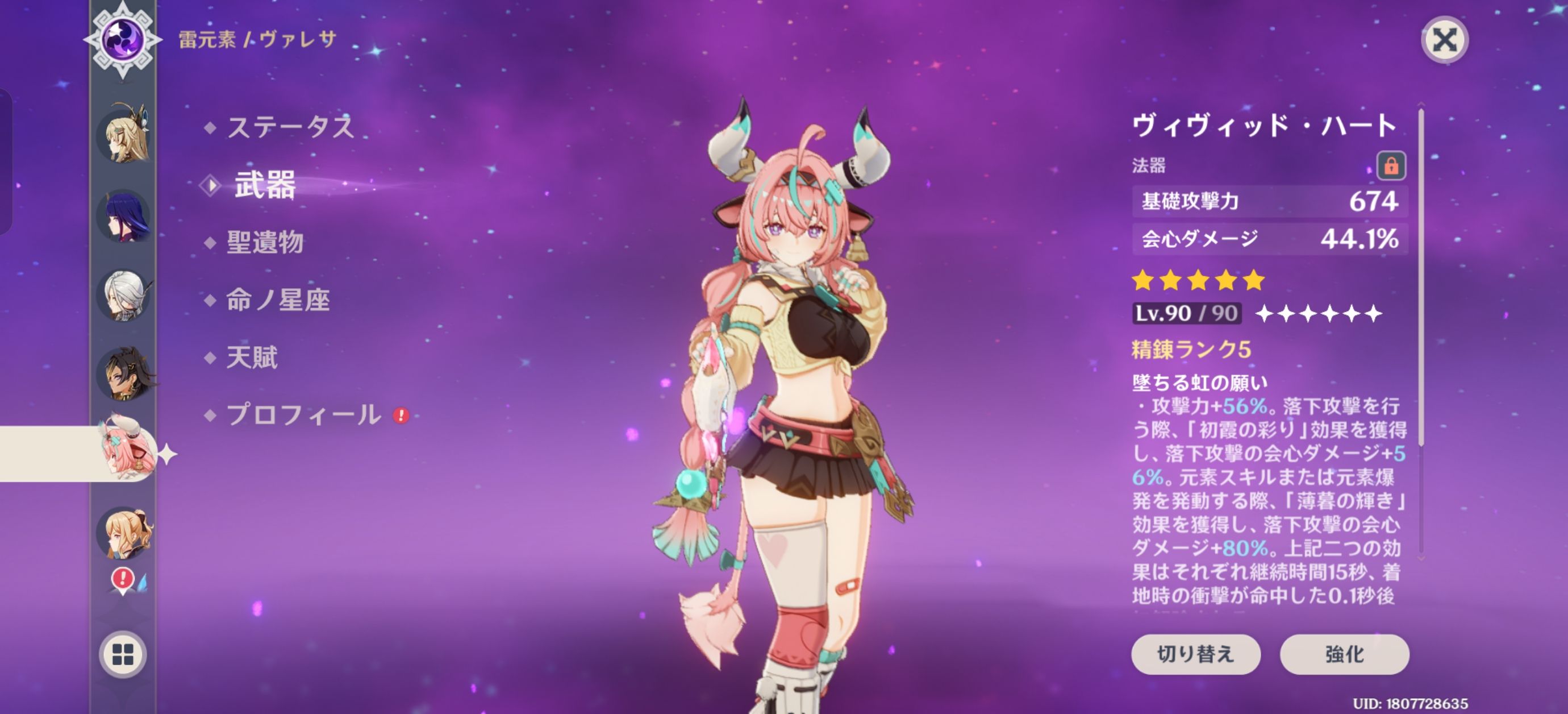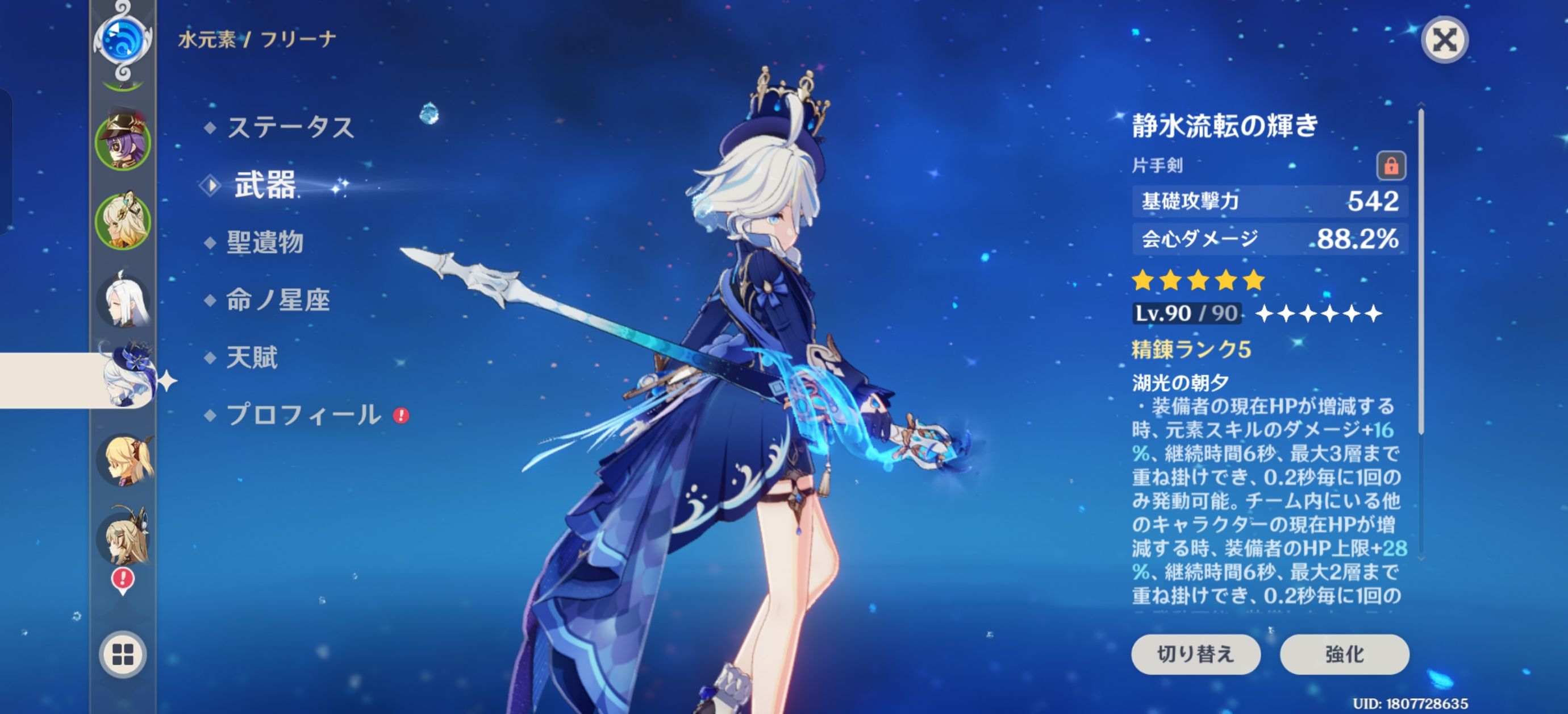 フリーナ、召使、ヴァレサなど完凸しており、持ち武器も完凸しています。恒常キャラもだいたい完凸です。