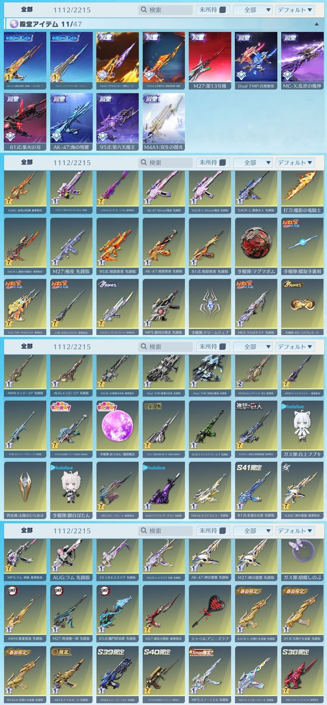光輪RK01(枕) オーラ:時の列車 擬似シン化:第13号機 熾火:炎華 霊想:海原の片隅 世界:双生の闇光 飛雲:竜胆天将 M4A1:双生の闇光 SACR-L:リキバノダンガン AK-47:海の残響 AK14:太陽の息吹 95式:第六天魔王 M27:第13号機 81式:業火の刃 MC-X:乱世の魔神 Dual TMP:白黒無常 M4A4:心を燃やせ 煉獄杏寿郎 M4A4:うずまきナルト