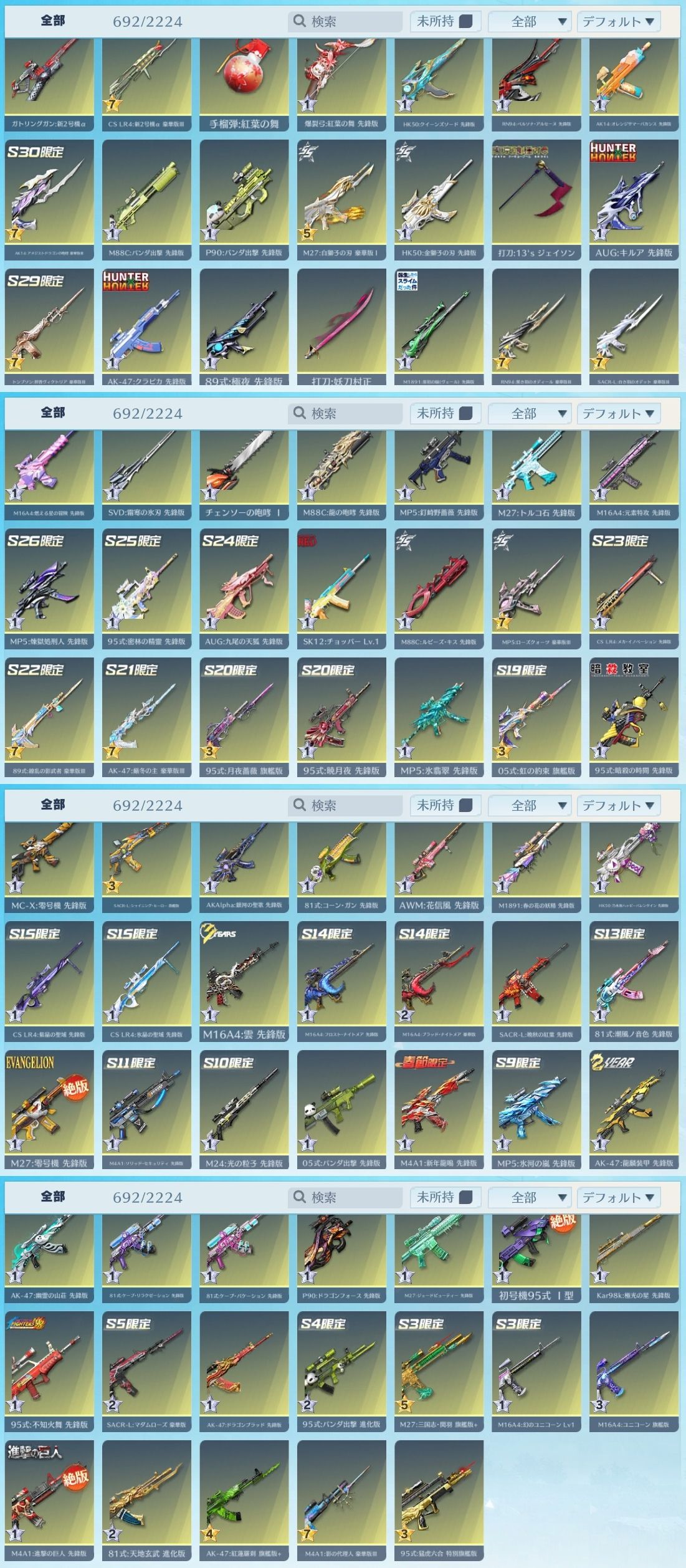 大領主N1 潮騒:マーメイドファンタジア 涅槃:氷炎のセラフ 鬼神:アズラーイール ダークマシン:ブラッド・アビス 螺旋:氷雪の炎竜 擬似シン化:第13号機 熾火:炎華 M27:第13号機 Dual TMP:白黒無常 M4A4:うずまきナルト PP2000:ヤマタノオロチ アズラーイール 淵火 第13号機 飛行服:コーン登場 パラシュート:デュエット(殿堂パラシュート) オブジェ:人類補完 伏黒恵 五条悟 エレン ミカサ リヴァイ アスカ レイ