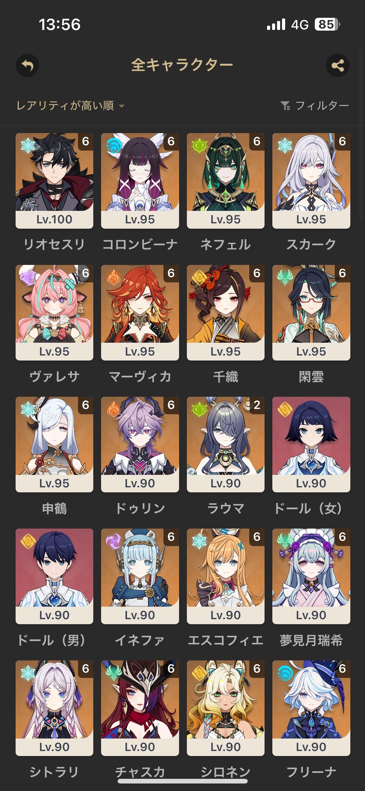 C6R5リオセスリ、コロンビーナ、ネフェル、スカーク、ヴァレサ、マーヴィカ、千織、イネファ、エスコフィエ、シトラリ、シロネン、閑雲、八重神子
