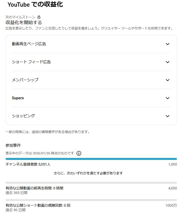 ✔収益化条件のうち、難しいと言われている「登録者1000人」をクリア済みなので、収益化までの期間を短縮出来る。