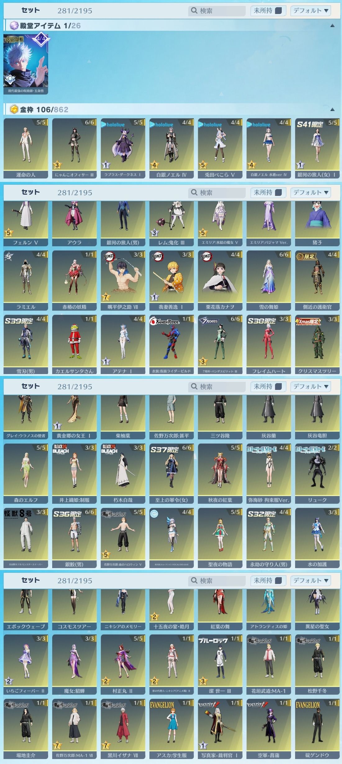 下記のようなスキンを所持しております。(一部抜粋)現代最強の呪術師・五条悟 熾火:炎華 AK-47:現代最強の呪術師・五条悟 M27:第13号機 M16A4:マーメイドファンタジア Dual TMP:白黒無常 五条悟:無下限呪術の使い手 飛行服:コーン登場 五条悟