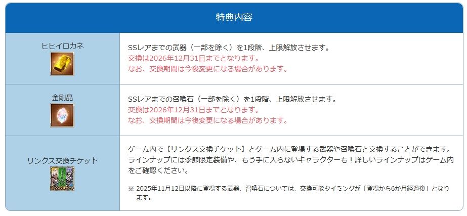 期間限定キャラが交換できるリンクス交換チケットのほか、ヒヒイロカネか金剛晶を選択することも出来ます。