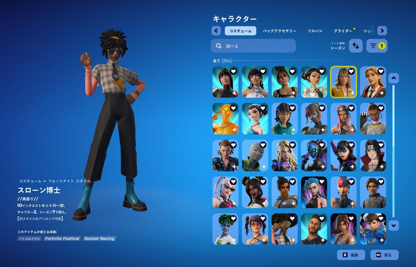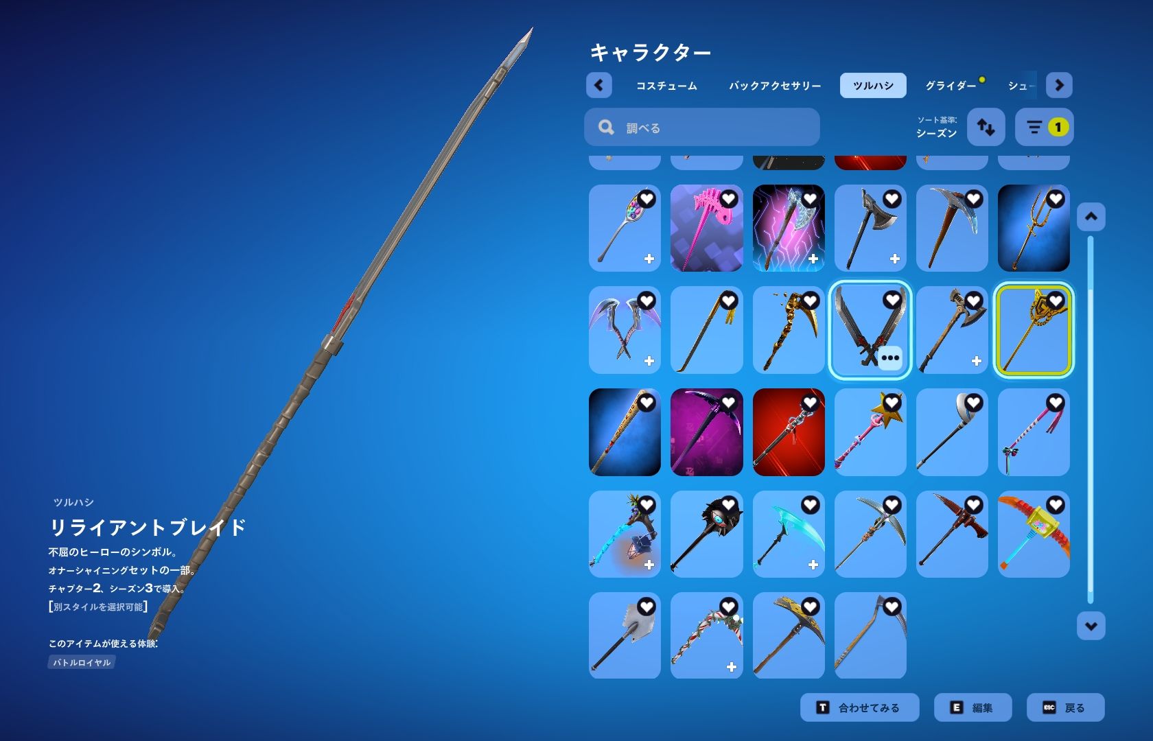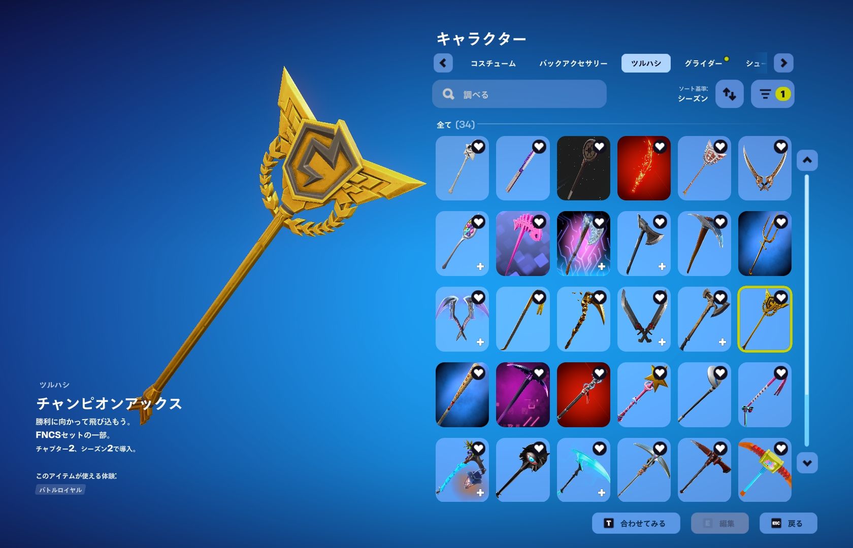 約450個スキンがあり、人気スキンや競技勢が使うスキン、グライダー、ラップ、ツルハシなどは大抵持っています。