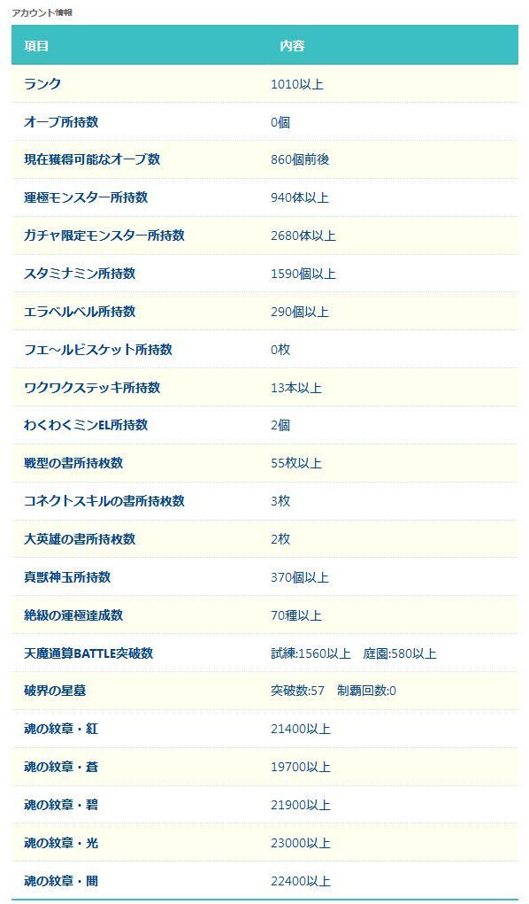 アカウント特定防止といった観点から、主なモンスターを抜粋して記載させていただいております。