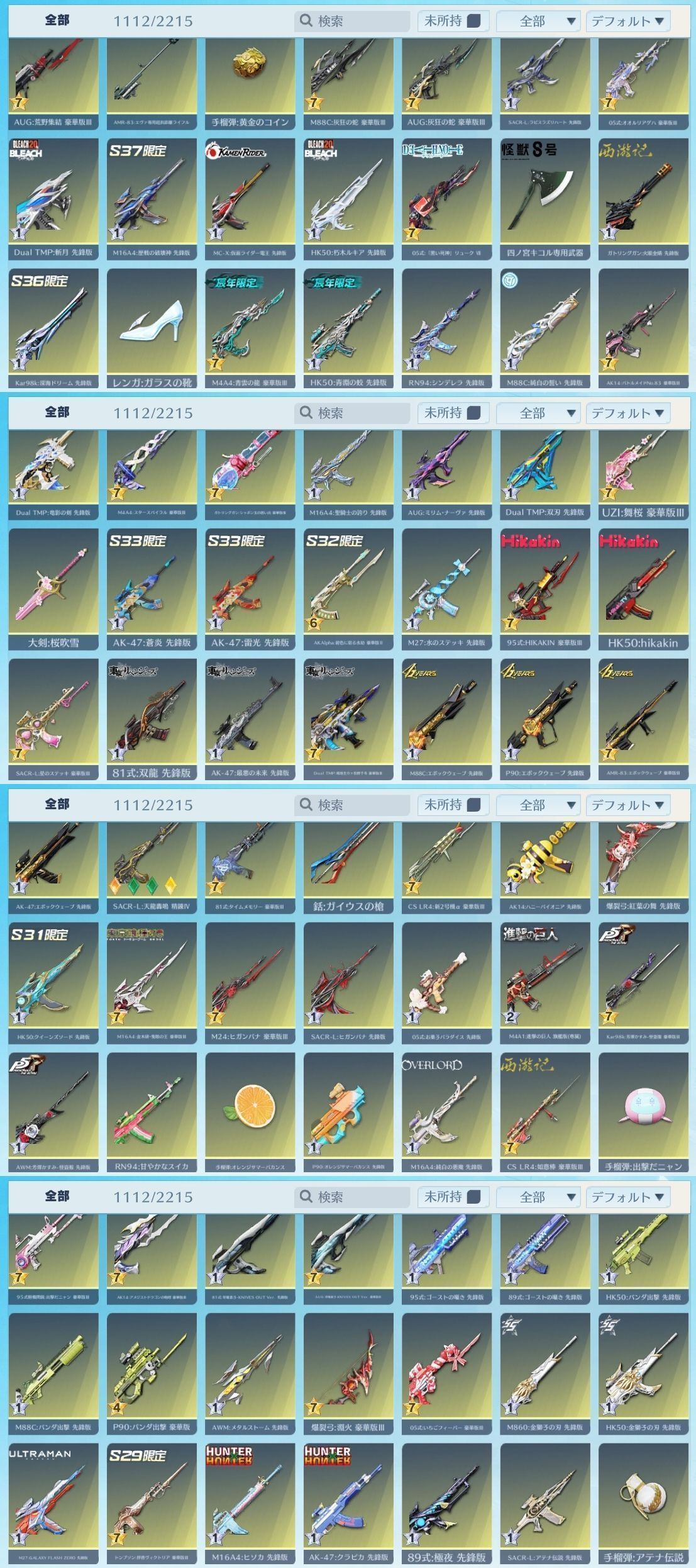 光輪RK01(枕) オーラ:時の列車 擬似シン化:第13号機 熾火:炎華 霊想:海原の片隅 世界:双生の闇光 飛雲:竜胆天将 M4A1:双生の闇光 SACR-L:リキバノダンガン AK-47:海の残響 AK14:太陽の息吹 95式:第六天魔王 M27:第13号機 81式:業火の刃 MC-X:乱世の魔神 Dual TMP:白黒無常 M4A4:心を燃やせ 煉獄杏寿郎 M4A4:うずまきナルト