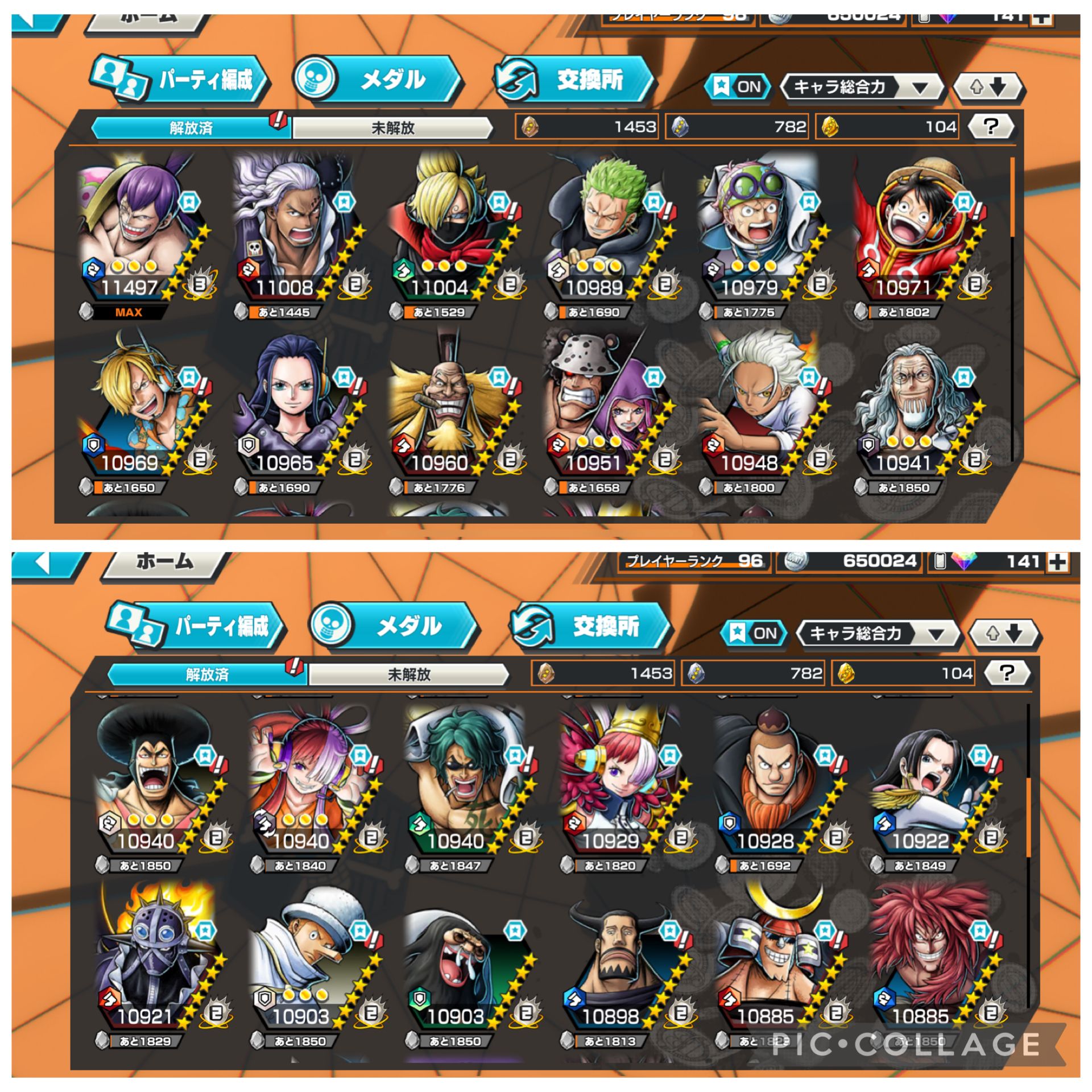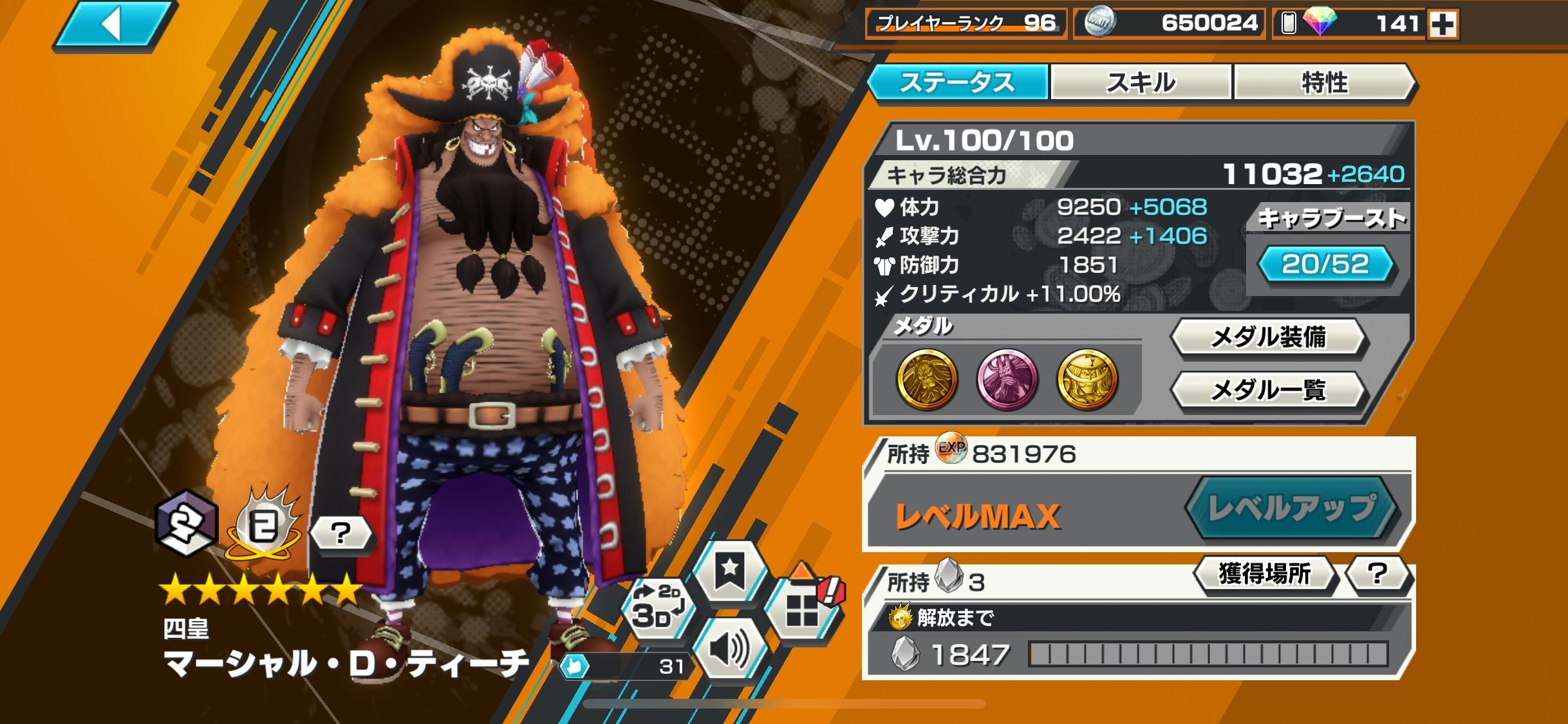 最新超フェスの黒髭もレベル100になっています。黒髭用のメダルも完成済。その他メダルも王道の物はある程度完成しています。ハンコ3種、カイドウ3種、ルフィ3種etc